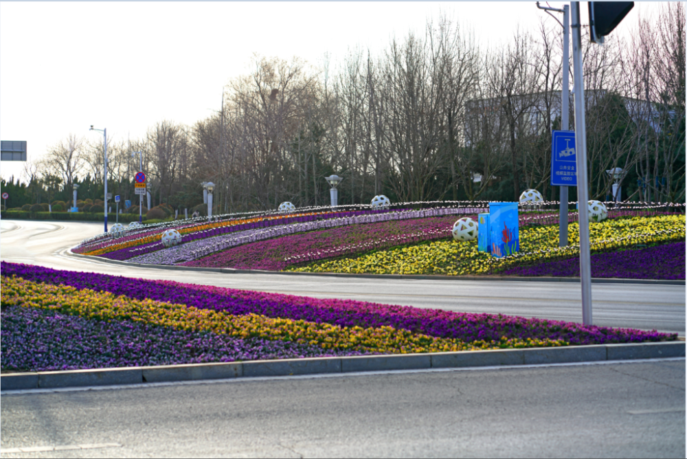 深圳路上的樱花 行走在樱花大道上,随处可见拍照打卡的行人,有路过的学生,也有散步的老人,还有拍写真、情侣照的市民。风吹过,漫地樱花瓣飞舞,像是下了一场粉色的雪。在樱花大道的尽头,还有学生自发组织的随机舞蹈活动,为校园增添一抹生机。 街头有繁花,这些马路都可打卡 当岛城公园里繁花似锦时,很多市民也会发现街头的美妙风景。青岛公园城市的建设,让更多人发现身边即花园,走在春华盛开的马路上,就如同逛公园一般。 早春时节,崂山区选用了耐低温三色堇和角堇4个系列9个品系进行栽种,其中角堇以表现良好的“亮点”系列为主,能适应零下5℃环境且色彩丰富;三色堇以表现良好的“微笑”系列为主,能适应零下15℃低温环境且颜色明快。所用花卉均在青岛本地培育,经过耐寒处理,增强了抗寒性,可耐轻度霜冻,培育时从温度、光照、水分等方面控制花期,以保证花卉栽植后即可呈现很好的观赏效果。