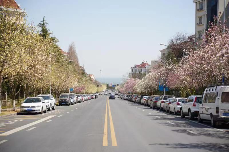 海宁路上的玉兰 不仅如此,深圳路的樱花,崂山路的碧桃、海棠,海安路的紫叶李,燕岭路的连翘,也迎来了他们的盛花期,美不胜收,走在路上,让人感受到了浓郁的春天的气息,仿佛置身一片花的海洋,与花海崂山的主题相辅相成。欢迎市民朋友参照崂山城管局提供的赏花路线图到崂山街头打卡!