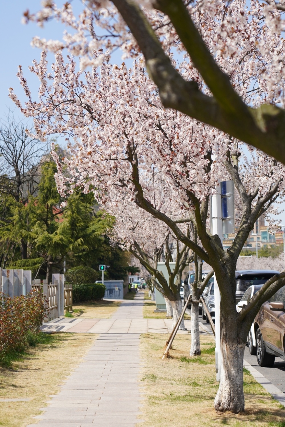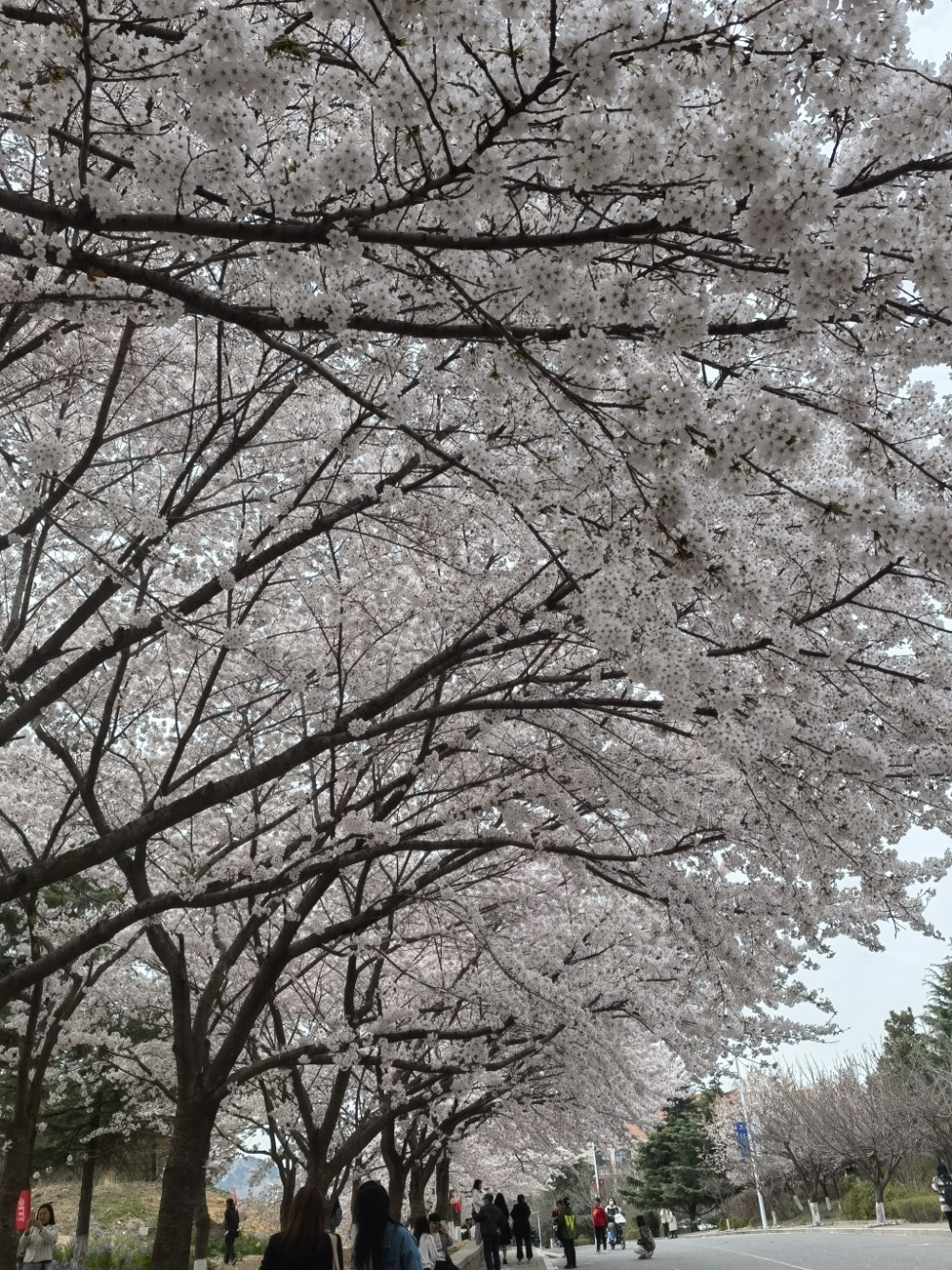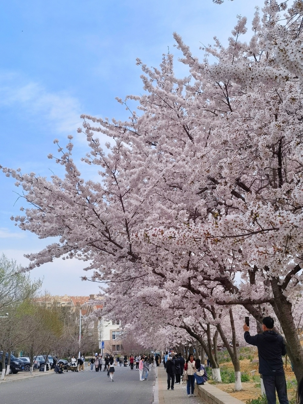 海大樱花 拿出身份证在闸机口“滴”一下,就进入了校园,按照“赏樱指引”,进门后沿左手边直行,绕过学生宿舍,便来到了樱花大道。放眼望去,道路两旁的樱花树高低交错,层层叠叠,在春风里舒展开了身姿。有的花团锦簇,在阳光照耀下欲语含羞,如云似锦;有的垂眸含苞,在夕阳的映射下化作点点霞光,如梦似幻。 道路两旁的樱树品种不同,一侧的单樱树已经绽放,几点粉嫩初上枝头,歪头探脑的望着教学楼,扶风摇曳,暗送芬芳。另一侧的双樱树开的略晚一些,但花期更久,色彩更为鲜亮。阳光和煦时,樱花树繁茂的花枝,伸展成粉红的走廊;海风袭来便洒下满园樱花雨,为道路增添几分亮色。