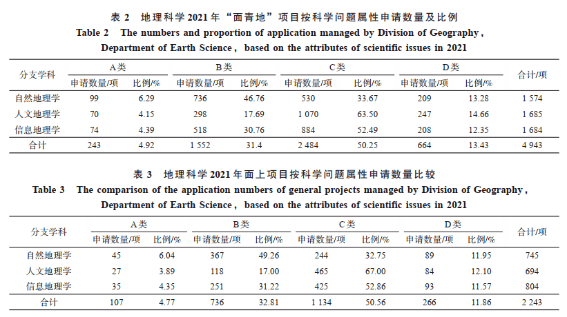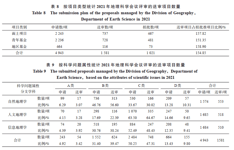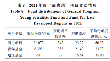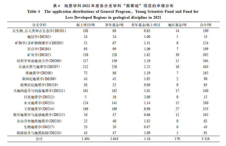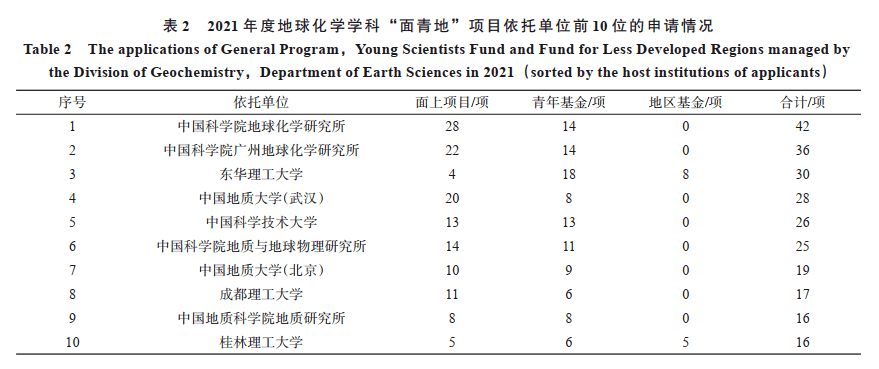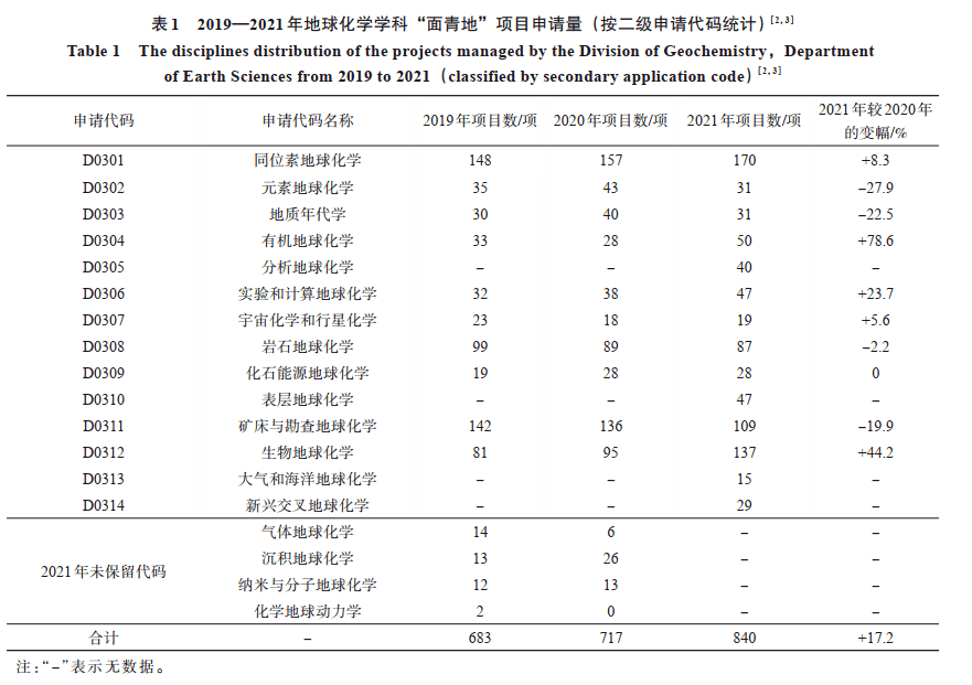 2021 年度,地球化学学科共收到项目申请 1 003 项,其中面上项目 369 项、青年科学基金项目399 项、地区科学基金项目72 项、国家杰出青年科学基金项目31 项、优秀青年科学基金项目49 项、学部优先资助领域“资源能源形成理论及供给潜力”重点项目 83 项。