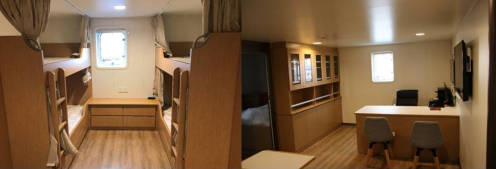 行程包括四晚科考船住宿。南海的夜晚,海面如镜面,繁星点点倒影海面,营员们头枕着波涛入睡,海风轻吹船轻摇。两种不同类型的舱位,这将是营员们非常难得的一种体验。 房间面积15平方米,配有独立卫浴 船上WI-FI覆盖,厨师准备用一日三餐 船上配有健身房、KTV等休闲设施 甲板烧烤派对