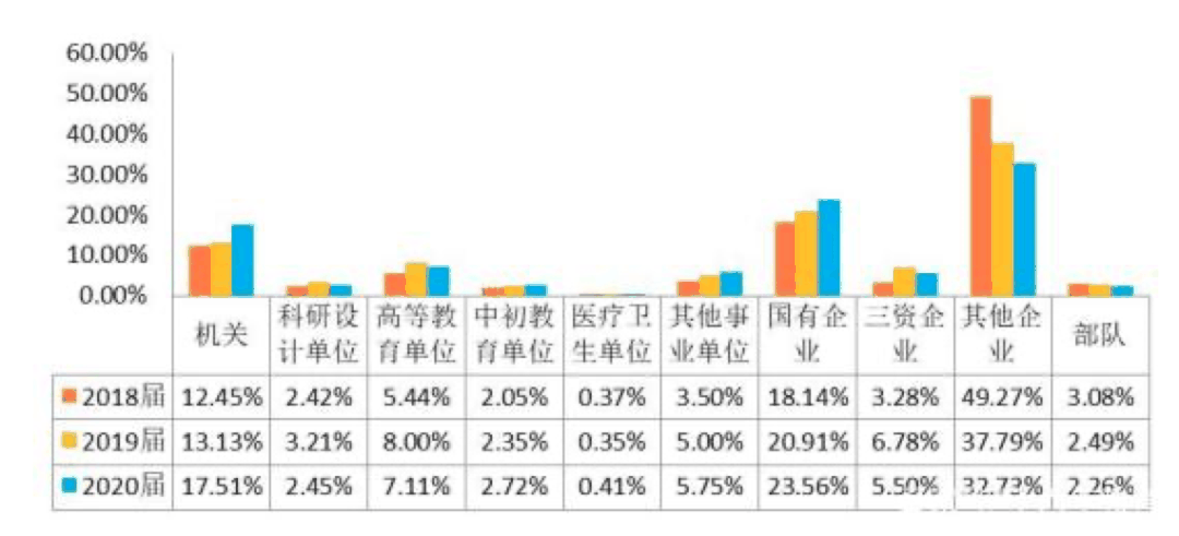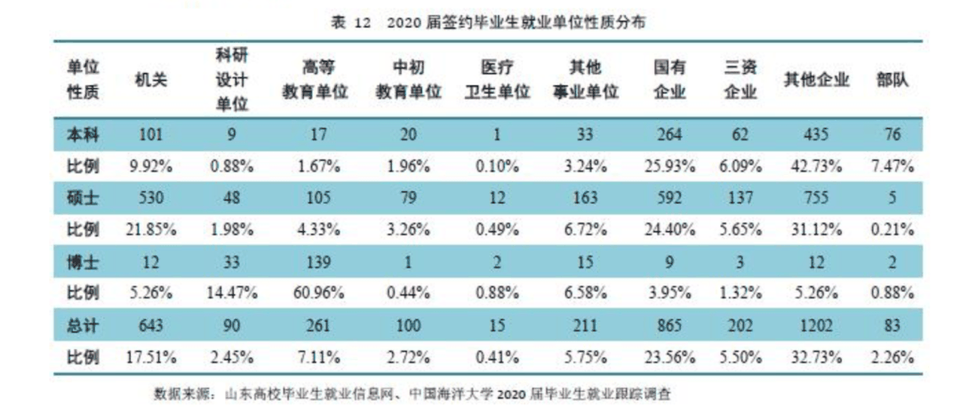 尽管海洋大学尚未公布2021年就业质量报告,但在过去三年,海大毕业生进入体制内的比例也在大幅增加。2018年、2019年、2020年比例分别为44.37%、52.94%、59.51%。 据相关媒体报道,高校就业指导、毕业生就业方向亦多呈现对体制内工作的偏好。北京大学“全国高校毕业生就业状况调查”课题组于2021年6月起对高校毕业生进行了问卷调查,样本量超过2万人。统计结果显示,已确定工作单位的毕业生中,到体制内单位(国有企业、党政机关、事业单位)入职的高校毕业生接近一半(49.3%),其中到中小学和高校工作的合计占比为9%。 目前,驻青各高校尚未发布2021届毕业生就业质量报告,但从2020届毕业生就业情况,也能看出一些变化趋势。 1、中国海洋大学2020届毕业生就业情况