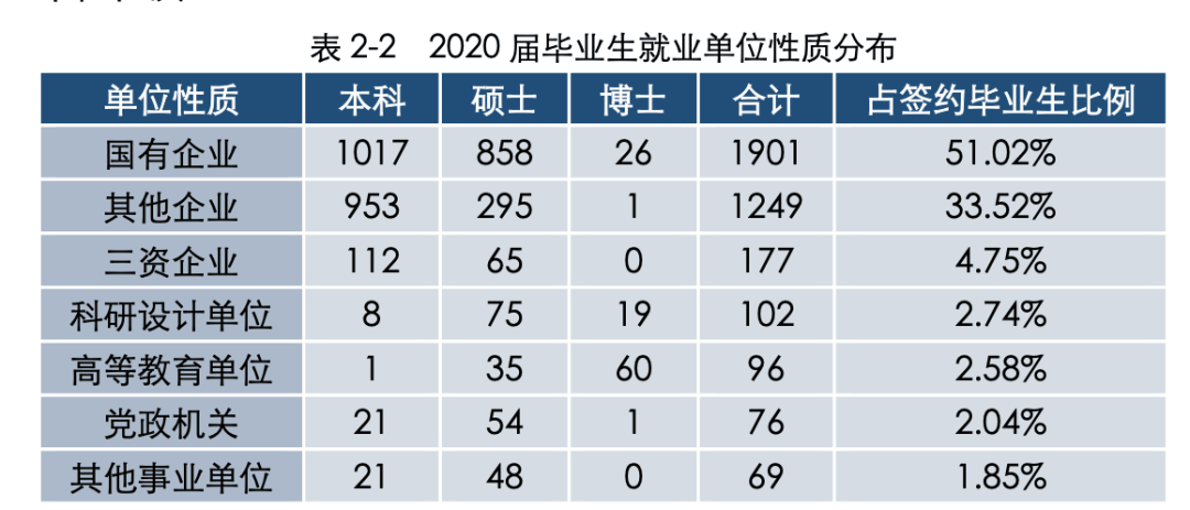 从地域来看,中国海大2020年毕业生中,继续在青岛的占比最高,总计有1297名毕业生留在青岛,占比35.32%。 而在2020年海大毕业生就业单位去向中,国企占比最高,为23.56%。  具体来看,党政机关、科研设计单位、高等教育单位、中初教育单位、医疗卫生单位、其他事业单位、国有企业等体制内就业的人数分别为643人、90人、261人、100人、15人、211人、865人,合计比例59.51%,而且呈逐年增加趋势。 统计结果显示,中国石油大学(华东)2020届毕业生中签约单位所属行业,“制造业”(25.39%)、“采矿业”(21.34%)、“信息传输、软件和信息技术服务业”(10.20%)是毕业生就业数量最多的三个行业。在就业单位性质中,中国石油大学(华东)2020届毕业生进入国有企业占比最高,达到了51.02%,加上其他党政事业单位、科研单位,进入体制内的毕业生达到了61.73%。根据统计,吸纳中国石油大学(华东) 2020 届毕业生最多的单位前20中,除了中国石油天然气股份有限公司、中国石油化工集团有限公司、中国建筑股份有限公司、中国海洋石油集团有限公司等央企,还包括包括万华化学、潍柴、浪潮、海尔、青岛鼎信通讯股份有限公司、歌尔等山东企业,除了浪潮,其他均为胶东经济圈企业。