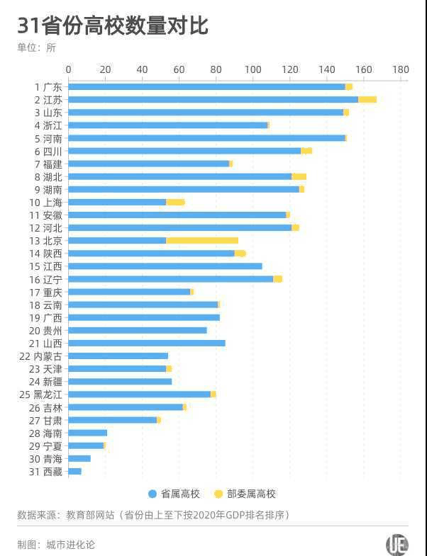 在很多人印象中,我国高校资源不均衡,更多体现在东西差距上。根据教育部数据,截至2020年6月30日,全国共有普通高等学校2740所(不含港澳台地区)。分省份来看,高教资源分布与划分人口分布的“胡焕庸线”暗合,西部地区整体排名靠后。