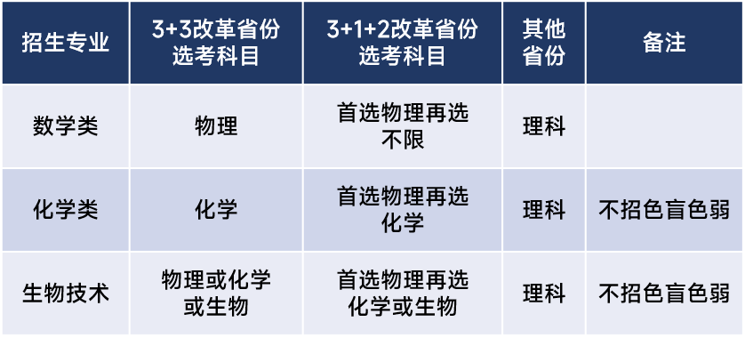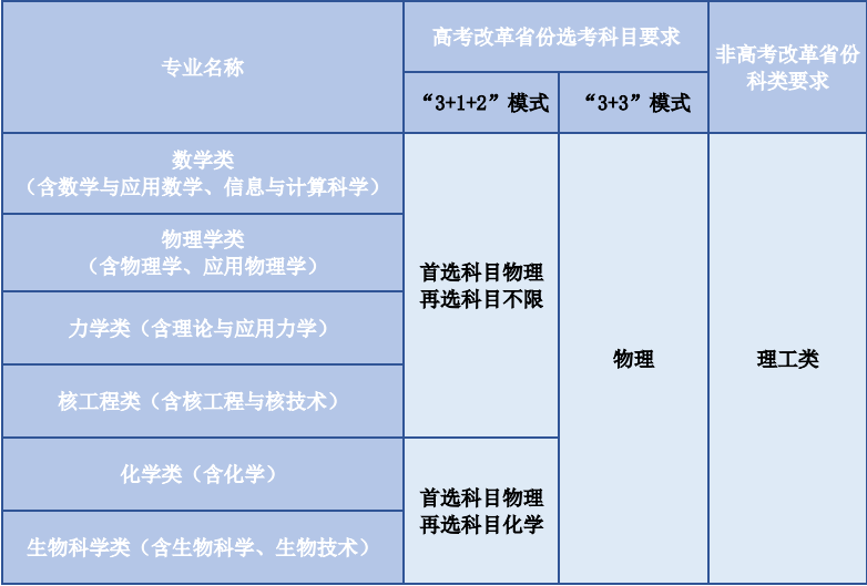 注:所有考生只能填报一个专业志愿。第二类考生只能报考获奖学科对应的招生专业(其中信息学奥林匹克竞赛对应数学与应用数学专业或物理学专业)。 报考南开大学强基计划的考生不能兼报其他高校,详细分省分专业招生计划请登录南开大学强基计划报名系统查看。 ■报名方式与选拔程序 (一)报名时间和办法 4月11日0:00至4月28日17:00考生可登录南开大学强基计划报名平台(网址:https://bm.chsi.com.cn/jcxkzs/sch/10055),按要求准确、完整地完成网上报名。 (二)考生参加统一高考 (三)学校考核 考生须在6月11日9:00-6月19日17:00登录报名系统确认是否参加南开大学强基计划考核并签订承诺书,在规定时间内打印准考证。 (四)7月5日前公布录取名单并公示录取标准。 天津大学 ■招生省市和专业 考生可在报名系统中查看天津大学招生专业的生源省份和招生计划。 招生专业包括数学与应用数学、应用物理学、应用化学、生物科学和工程力学。所有招生专业在非高考改革省份招收理科考生,在高考改革省份选考科目要求见下表: