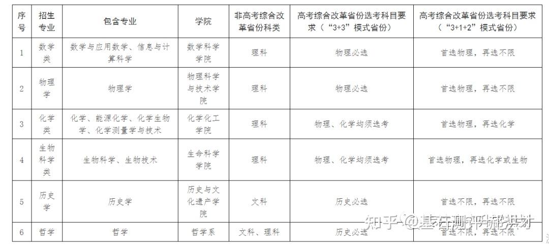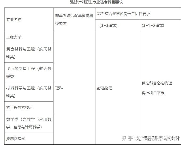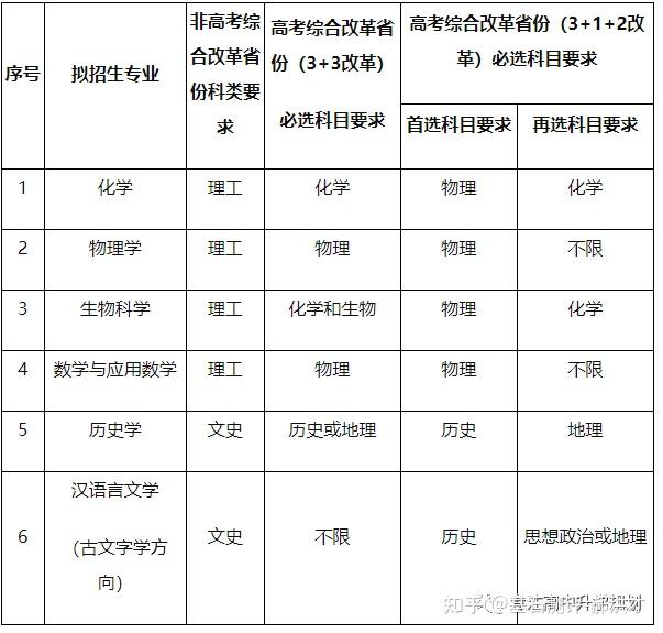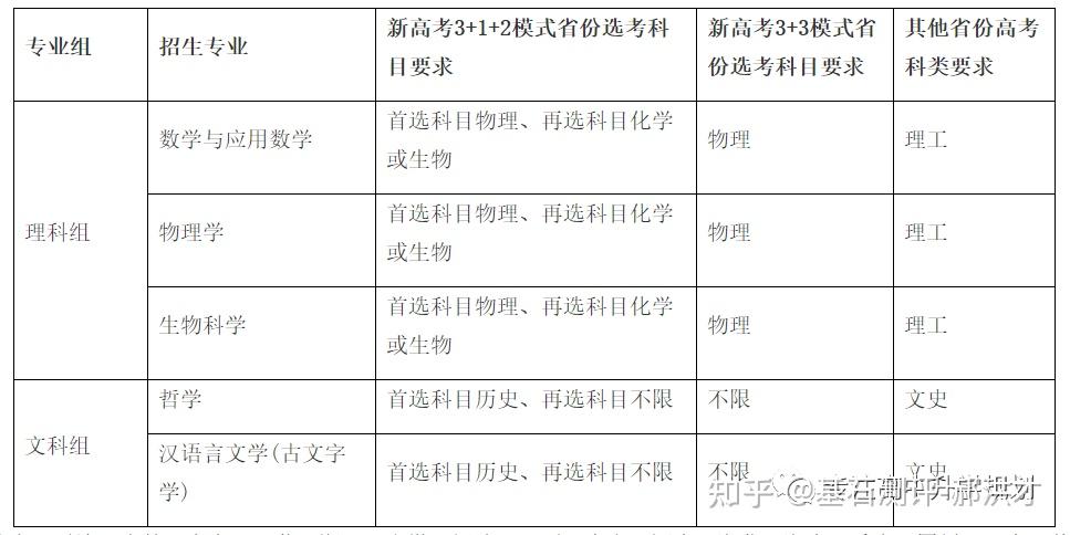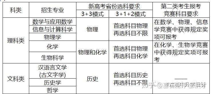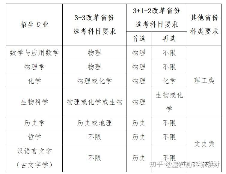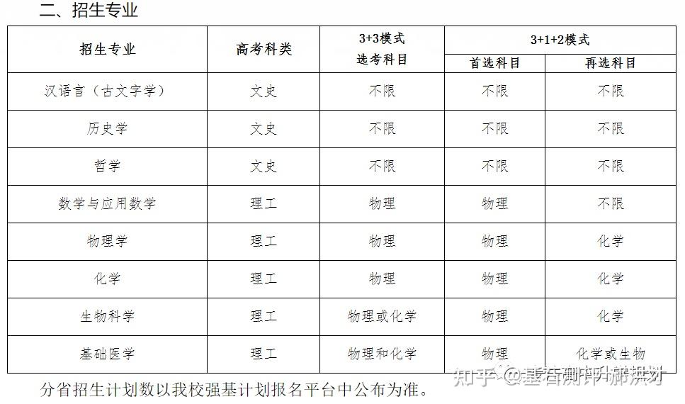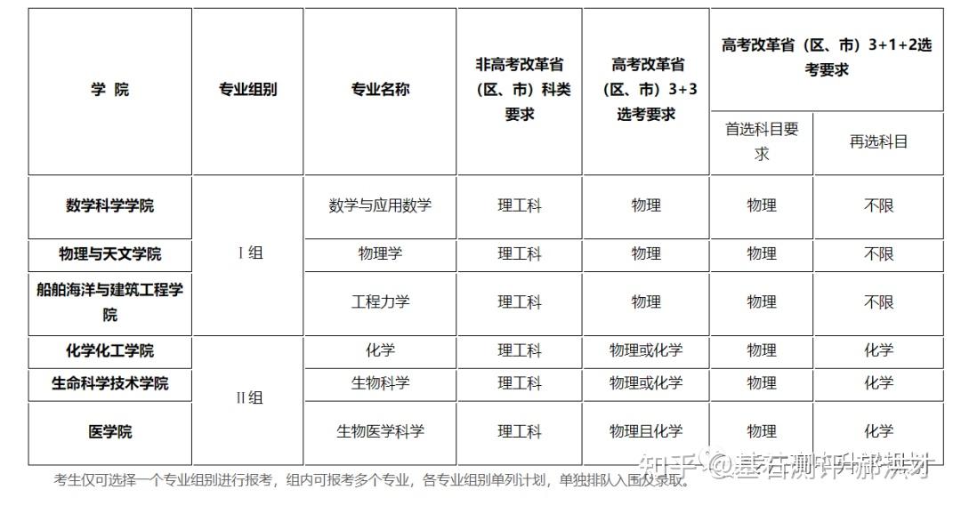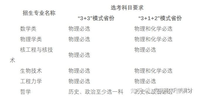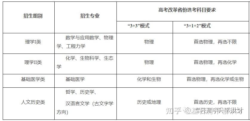 23年强基计划招生陆续开始,院校报名的截止时间基本都在4月30日之前,因此本文重点介绍院校的招生专业以及选科要求!如果家庭对哪所院校有兴趣,可以在公益课群里提问,会有专家老师进行解答!?特别提醒:强基计划在报名时就只能选择1所院校以下8所院校的校测在高考出分前,提前锁档! ![]() (C9/华5) 招生专业 1、每位考生限报一个招生组 2、笔试和综合面试时间:高考成绩公布前 3、23年广东普通批最低分数:物理:660 历史:645 ![]() ![]() (C9/华5) 招生专业 1、每位考生限报一个招生组,最多可填报不超过3个专业 2、笔试和综合面试时间:6月15日前(高考后、出分前,具体安排另行通知)举行初试,初试形式为笔试 3、23年广东普通批最低分数:物理:669 历史:639 ![]() ![]() (C9/华5) 招生专业 1、每位考生限报一个招生组,最多可填报不超过3个专业 2、笔试和综合面试时间:6月14日左右 3、23年广东普通批最低分数:物理:662 历史:631 ![]() ![]() 四、浙江大学(C9/华5) 招生专业 1、每位考生限报一个招生组别,最多可填报不超过3个专业 2、笔试和综合面试时间:高考后出分前 3、23年广东普通批最低分数:物理:670 历史:627 ![]() ![]() (C9/华5)招生专业1、考生最少应填报1个专业志愿,最多可填报6个专业志愿2、笔试和综合面试时间:高考后出分前3、23年广东普通批最低分数:物理:663 ![]() ![]() (C9/华5)招生专业1、考生最少应填报1个专业志愿,最多可填报6个专业志愿2、笔试和综合面试时间:高考后1周内3、23年广东普通批最低分数:物理:609 历史:599 ![]() ![]() 七、同济大学招生专业1、第一类考生选择一个专业组填报,最多填报组内所有专业,并选择是否服从组内调剂。2、笔试和综合面试时间:6月15日前3、23年广东普通批最低分数:物理:640 历史:619 ![]() ![]() 八、厦门大学招生专业1、第一类考生选择一个专业组填报,最多填报组内所有专业,并选择是否服从组内调剂。2、笔试和综合面试时间:初试安排在高考后一周内,形式为笔试,主要考核学生学科素养基础,将于6月22日前进行,复试含笔试、面试和体育测试。3、23年广东普通批最低分数:总校:物理:624 历史:607马来西亚分校:物理 584 历史 565 ![]() 以下院校都是在高考出分后参加学校校测 ![]() 1、兰州大学 1、招生专业(考生只能填报一个专业) 2、23年广东普通批最低分数:物理:601 历史:581 ![]() ![]() 2、华南理工大学 1、招生专业(考生只能填报一个专业) 2、23年广东普通批最低分数:物理:613 历史:592 ![]() ![]() 3、湖南大学 1、招生专业2、23年广东普通批最低分数:物理:610 历史:593 ![]() ![]() 4、西北工业大学 1、招生专业 2、23年广东普通批最低分数:物理:621 历史:586 ![]() ![]() 5、北京航空航天 1、招生专业(考生只可填报1个专业志愿) 2、23年广东普通批最低分数:物理:654 历史:605 ![]() ![]() 6、中央民族大学(广东不招生) 1、招生专业 2、23年广东普通批最低分数:物理:605 历史:590 招生专业:历史学、哲学,每名考生限报一个专业。 其中历史学:在高考综合改革省份,要求考生选考历史科目;在非高考改革省份,招收文史类考生。 ![]() 7、中国人民大学 1、招生专业 2、23年广东普通批最低分数: 总校:物理:665 历史:633 苏州校区:物理:630 历史:595 ![]() ![]() 8、中山大学 1、招生专业 2、23年广东普通批最低分数:物理:614 历史:602 ![]() ![]() 9、北京师范大学 1、招生专业 2、23年广东普通批最低分数: 总校:物理:653 历史:612 珠海校区:物理:617 历史 :599 招生专业: 考生仅可选择一个专业组进行报考,填报该专业组内招生专业,文科专业组可填报一至两个专业,理科专业组可填报一至四个专业,并填报是否服从专业调剂。 ![]() ![]() 10、北京理工大学 1、招生专业 2、23年广东普通批最低分数:物理:615 历史:596 ![]() ![]() 11、中国农业大学 23年广东普通批最低分数:物理:601 历史:582 ![]() ![]() 12、南开大学 23年广东普通批最低分数:物理:637 历史:614 ![]() ![]() 13、东南大学 23年广东普通批最低分数:物理:636 历史:599 ![]() ![]() 14、山东大学 23年广东普通批最低分数:物理:613 历史:594 ![]() ![]() 15、中国海洋大学 23年广东普通批最低分数:物理:594 历史:582 ![]() ![]() 16、中南大学 23年广东普通批最低分数:物理:605 历史:593 ![]() ![]() 17、武汉大学 23年广东普通批最低分数:物理:631 历史:588 ![]() ![]() 18、华中科技大学 23年广东普通批最低分数:物理:609 历史:600 数学与应用数学、物理学、化学、生物科学、基础医学﹑汉语言文学(古文字学方向)﹑哲学 ![]() 19、重庆大学 23年广东普通批最低分数:物理:608 历史:593 ![]() ![]() 20、电子科技大学 23年广东普通批最低分数: 总校:物理:632 沙河校区:609 ![]() ![]() 21、四川大学 23年广东普通批最低分数:物理:612 历史:598 ![]() ![]() 22、天津大学 23年广东普通批最低分数:物理:626 ![]() ![]() 23、吉林大学(广东不招生) 23年广东普通批最低分数:物理:608 历史:590 ![]() ![]() 24、华东师范大学(广东不招生) 23年广东普通批最低分数:物理:639 历史:607 ![]() ![]() 25、国防科技大学(广东不招生) 数学和物理学 ![]() 26、西北农林科技大学(广东不招生) 23年广东普通批最低分数:物理:583 历史:577 ![]() ![]() 27、北京大学(C9) 简章未发布 23年广东普通批最低分数:物理:683 历史:651 ![]() 28、清华大学(C9)简章未发布 23年广东普通批最低分数:物理:683 历史:651 ![]() 29、哈尔滨工业大学(C9) 招生专业 ![]() 本硕博