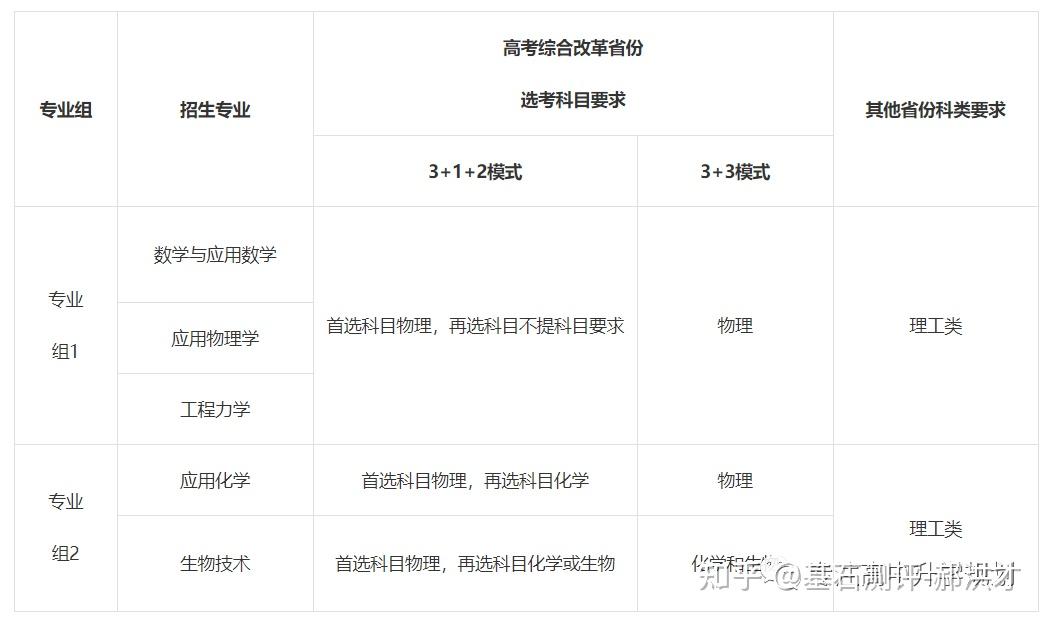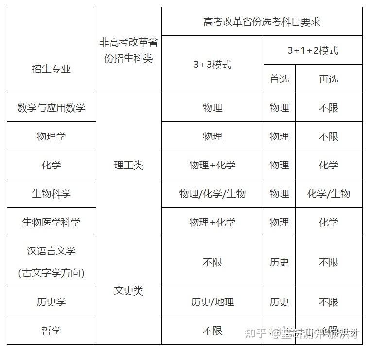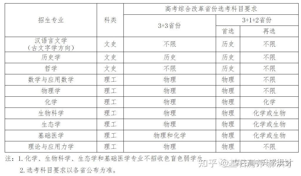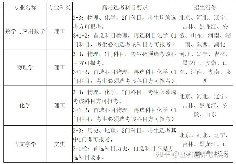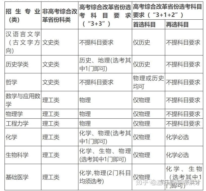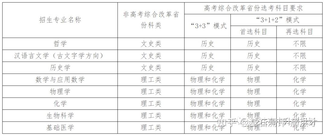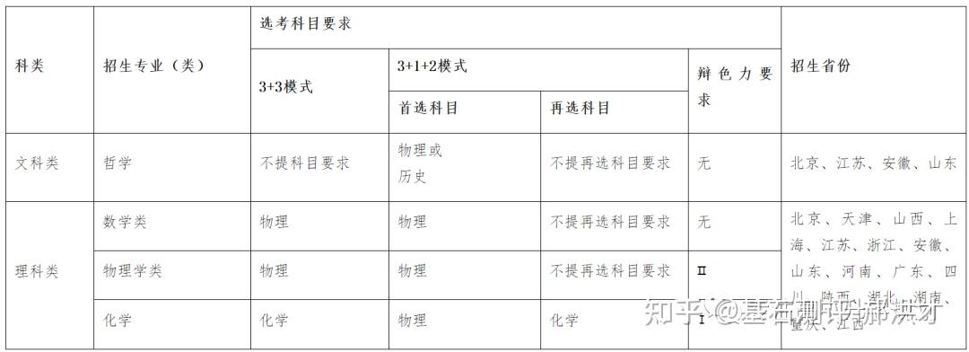 23年强基计划招生陆续开始,院校报名的截止时间基本都在4月30日之前,因此本文重点介绍院校的招生专业以及选科要求!如果家庭对哪所院校有兴趣,可以在公益课群里提问,会有专家老师进行解答!?特别提醒:强基计划在报名时就只能选择1所院校以下8所院校的校测在高考出分前,提前锁档! ![]() (C9/华5) 招生专业 1、每位考生限报一个招生组 2、笔试和综合面试时间:高考成绩公布前 3、23年广东普通批最低分数:物理:660 历史:645 ![]() ![]() (C9/华5) 招生专业 1、每位考生限报一个招生组,最多可填报不超过3个专业 2、笔试和综合面试时间:6月15日前(高考后、出分前,具体安排另行通知)举行初试,初试形式为笔试 3、23年广东普通批最低分数:物理:669 历史:639 ![]() ![]() (C9/华5) 招生专业 1、每位考生限报一个招生组,最多可填报不超过3个专业 2、笔试和综合面试时间:6月14日左右 3、23年广东普通批最低分数:物理:662 历史:631 ![]() ![]() 四、浙江大学(C9/华5) 招生专业 1、每位考生限报一个招生组别,最多可填报不超过3个专业 2、笔试和综合面试时间:高考后出分前 3、23年广东普通批最低分数:物理:670 历史:627 ![]() ![]() (C9/华5)招生专业1、考生最少应填报1个专业志愿,最多可填报6个专业志愿2、笔试和综合面试时间:高考后出分前3、23年广东普通批最低分数:物理:663 ![]() ![]() (C9/华5)招生专业1、考生最少应填报1个专业志愿,最多可填报6个专业志愿2、笔试和综合面试时间:高考后1周内3、23年广东普通批最低分数:物理:609 历史:599 ![]() ![]() 七、同济大学招生专业1、第一类考生选择一个专业组填报,最多填报组内所有专业,并选择是否服从组内调剂。2、笔试和综合面试时间:6月15日前3、23年广东普通批最低分数:物理:640 历史:619 ![]() ![]() 八、厦门大学招生专业1、第一类考生选择一个专业组填报,最多填报组内所有专业,并选择是否服从组内调剂。2、笔试和综合面试时间:初试安排在高考后一周内,形式为笔试,主要考核学生学科素养基础,将于6月22日前进行,复试含笔试、面试和体育测试。3、23年广东普通批最低分数:总校:物理:624 历史:607马来西亚分校:物理 584 历史 565 ![]() 以下院校都是在高考出分后参加学校校测 ![]() 1、兰州大学 1、招生专业(考生只能填报一个专业) 2、23年广东普通批最低分数:物理:601 历史:581 ![]() ![]() 2、华南理工大学 1、招生专业(考生只能填报一个专业) 2、23年广东普通批最低分数:物理:613 历史:592 ![]() ![]() 3、湖南大学 1、招生专业2、23年广东普通批最低分数:物理:610 历史:593 ![]() ![]() 4、西北工业大学 1、招生专业 2、23年广东普通批最低分数:物理:621 历史:586 ![]() ![]() 5、北京航空航天 1、招生专业(考生只可填报1个专业志愿) 2、23年广东普通批最低分数:物理:654 历史:605 ![]() ![]() 6、中央民族大学(广东不招生) 1、招生专业 2、23年广东普通批最低分数:物理:605 历史:590 招生专业:历史学、哲学,每名考生限报一个专业。 其中历史学:在高考综合改革省份,要求考生选考历史科目;在非高考改革省份,招收文史类考生。 ![]() 7、中国人民大学 1、招生专业 2、23年广东普通批最低分数: 总校:物理:665 历史:633 苏州校区:物理:630 历史:595 ![]() ![]() 8、中山大学 1、招生专业 2、23年广东普通批最低分数:物理:614 历史:602 ![]() ![]() 9、北京师范大学 1、招生专业 2、23年广东普通批最低分数: 总校:物理:653 历史:612 珠海校区:物理:617 历史 :599 招生专业: 考生仅可选择一个专业组进行报考,填报该专业组内招生专业,文科专业组可填报一至两个专业,理科专业组可填报一至四个专业,并填报是否服从专业调剂。 ![]() ![]() 10、北京理工大学 1、招生专业 2、23年广东普通批最低分数:物理:615 历史:596 ![]() ![]() 11、中国农业大学 23年广东普通批最低分数:物理:601 历史:582 ![]() ![]() 12、南开大学 23年广东普通批最低分数:物理:637 历史:614 ![]() ![]() 13、东南大学 23年广东普通批最低分数:物理:636 历史:599 ![]() ![]() 14、山东大学 23年广东普通批最低分数:物理:613 历史:594 ![]() ![]() 15、中国海洋大学 23年广东普通批最低分数:物理:594 历史:582 ![]() ![]() 16、中南大学 23年广东普通批最低分数:物理:605 历史:593 ![]() ![]() 17、武汉大学 23年广东普通批最低分数:物理:631 历史:588 ![]() ![]() 18、华中科技大学 23年广东普通批最低分数:物理:609 历史:600 数学与应用数学、物理学、化学、生物科学、基础医学﹑汉语言文学(古文字学方向)﹑哲学 ![]() 19、重庆大学 23年广东普通批最低分数:物理:608 历史:593 ![]() ![]() 20、电子科技大学 23年广东普通批最低分数: 总校:物理:632 沙河校区:609 ![]() ![]() 21、四川大学 23年广东普通批最低分数:物理:612 历史:598 ![]() ![]() 22、天津大学 23年广东普通批最低分数:物理:626 ![]() ![]() 23、吉林大学(广东不招生) 23年广东普通批最低分数:物理:608 历史:590 ![]() ![]() 24、华东师范大学(广东不招生) 23年广东普通批最低分数:物理:639 历史:607 ![]() ![]() 25、国防科技大学(广东不招生) 数学和物理学 ![]() 26、西北农林科技大学(广东不招生) 23年广东普通批最低分数:物理:583 历史:577 ![]() ![]() 27、北京大学(C9) 简章未发布 23年广东普通批最低分数:物理:683 历史:651 ![]() 28、清华大学(C9)简章未发布 23年广东普通批最低分数:物理:683 历史:651 ![]() 29、哈尔滨工业大学(C9) 招生专业 ![]() 本硕博