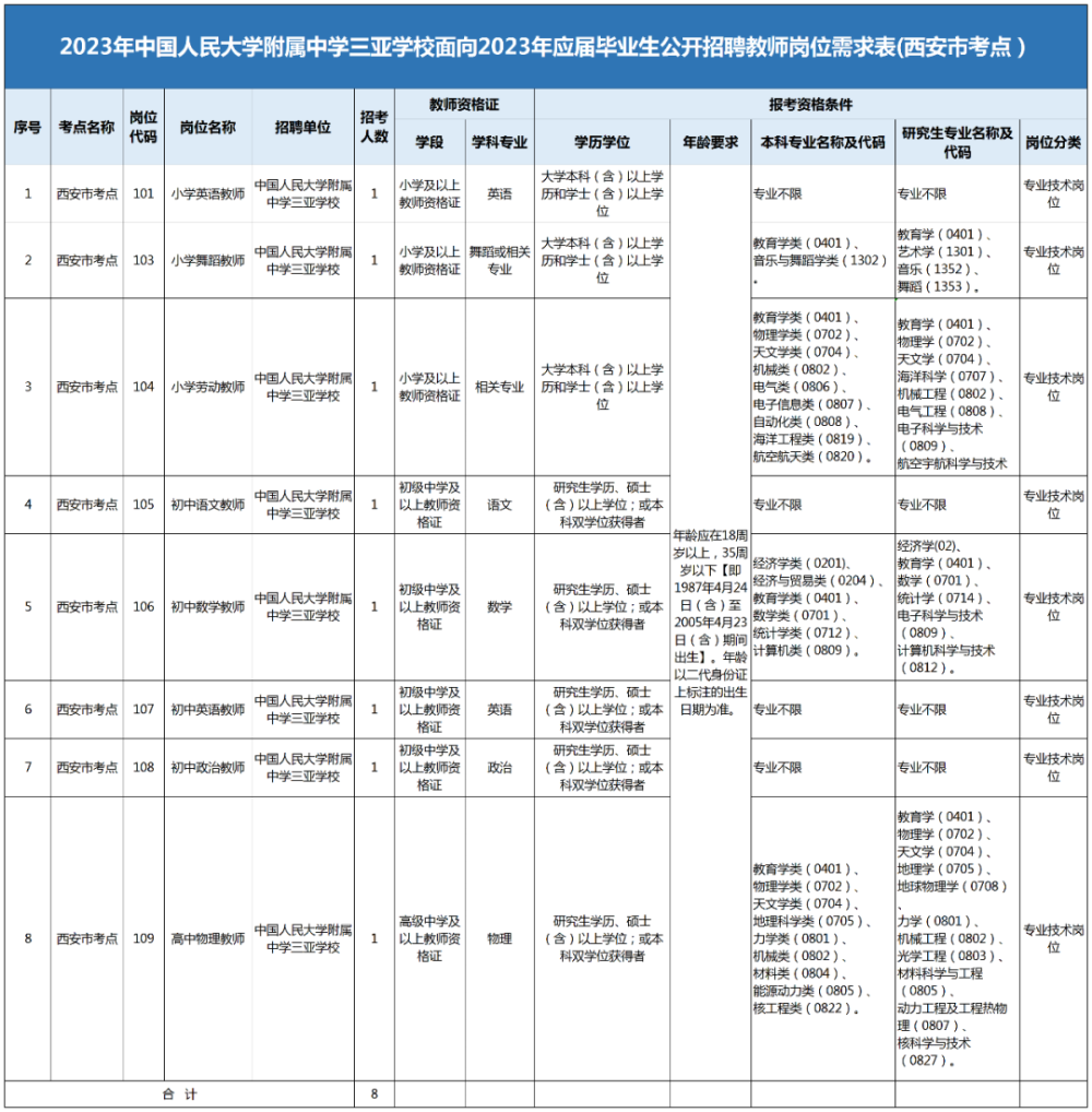 (上下滑动查看) 01 2023年中国人民大学附属中学三亚学校赴高校面向2023年应届毕业生公开招聘教师公告(西安市考点) (第5号) 为全面贯彻落实党的二十大及《中共中央国务院关于全面深化新时代教师队伍建设改革的意见》精神,根据《海南省事业单位公开招聘工作人员实施办法》(琼人社发〔2018〕516号)文件要求,决定进行校园自主招聘一批教师充实我校教师队伍。为做好公开招聘工作,结合我校教育工作实际,现将公开招聘相关事项公告如下: 一、指导思想和原则 (一)以习近平新时代中国特色社会主义思想为指导,全面贯彻党的教育方针,坚持把立德树人作为教育的根本任务。在市委、市政府的领导下,努力打造师德高尚、专业基础扎实、教育教学能力较强的“好教师”队伍。通过公开招聘,优化教师队伍结构,不断提高教育质量。 (二)按照“公平、公正、公开、择优”的要求,坚持“双向选择、严格把关、宁缺毋滥”的原则做好招聘工作。 二、招聘人数、岗位及薪酬待遇 (一)本次西安市考点共招聘8名教师,具体招聘的岗位(详见附件1)。所有岗位均为我市事业编制岗位,被聘用人员其工资及相关福利待遇按三亚市事业单位在编工作人员有关规定执行。 武汉市考点的招聘工作已经结束,因“0101-小学英语教师、0103-小学舞蹈教师、0104-小学劳动教师、0105-初中语文教师、0106-初中数学教师、0107-初中英语教师、0108-初中政治教师、0109-高中物理教师”8个岗位在武汉市考点无入围人员,故以上岗位继续在西安市考点开展招聘工作。