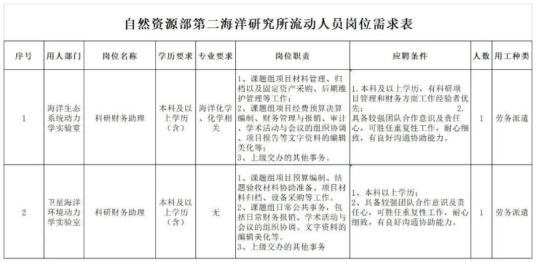 1、海洋二所现有2名劳务派遣用工需求,具体岗位详见《岗位需求表》(附件1)。