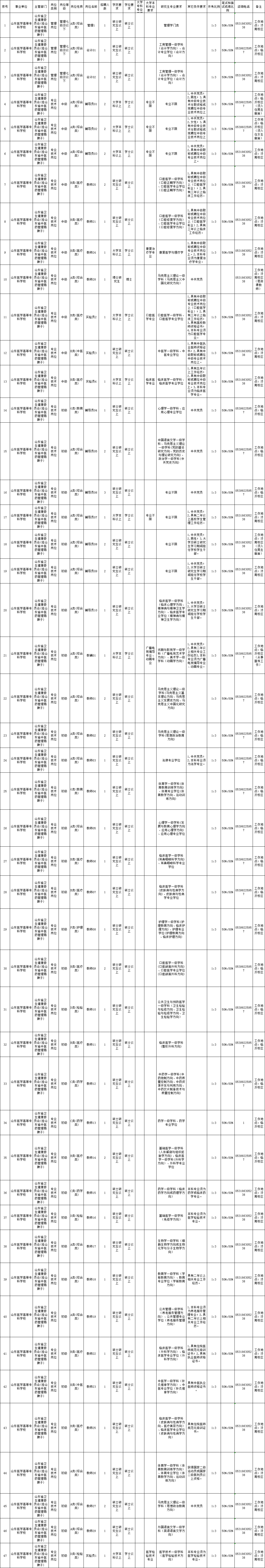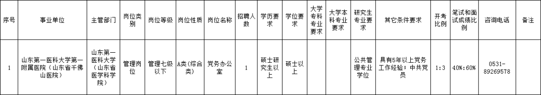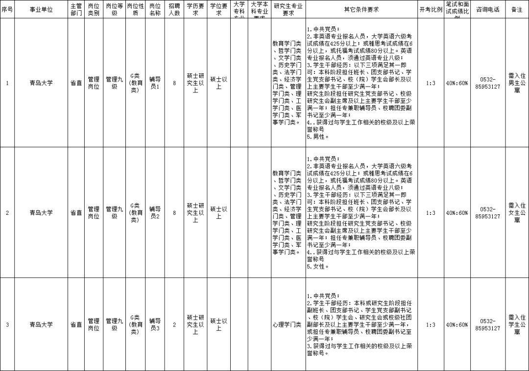 山东多家省属事业单位公开招聘, 一大波好岗位来了! 招聘岗位和人数 青岛大学 拟面向社会公开招聘专职辅导员18名。 (点击图片可放大查看) 报名时间 2022年5月12日9:00-5月18日17:00 报名方式 报名人员登录报名网站(http://rczp.qdu.edu.cn/)公开招聘网上报名系统进行报名,按要求如实填写、提交个人信息和报名资料。 山东省疾病预防控制中心 招聘岗位和人数 拟面向社会公开招聘初级岗位10人。 (点击图片可放大查看) 报名时间 2022年5月17日9:00-5月23日16:00。 报名方式 报名采取网络报名的方式进行。报名人员在规定时间内登录山东省疾病预防控制中心网站,点击报名链接进行报名,中心将安排专人负责资格审查。 山东商业职业技术学院 招聘岗位和人数 拟面向社会公开招聘教师15人。 (点击图片可放大查看) 报名时间 自简章发布之日起7个工作日(2022年5月10日9:00-5月18日17:00)。 报名方式 登录山东商业职业技术学院网站进行网上报名。 山东医学高等专科学校 招聘岗位和人数 拟面向社会公开招聘专业技术岗位工作人员58人(中级岗位14人,初级岗位44人),管理岗位工作人员3人。 (点击图片可放大查看) 报名时间 2022年5月10日9:00-2022年6月10日16:00 报名方式 采用网上报名的方式,符合条件的应聘人员请在规定的报名时间内登录“山东医学高等专科学校人事招聘系统”进行报名。 山东第一医科大学 第一附属医院 (山东省千佛山医院) 招聘岗位和人数 拟面向社会公开招聘硕士研究生1名,为管理岗位。 (点击图片可放大查看) 报名时间 自简章发布之日起7个工作日内(5月10日上午8:30-5月18日下午5:30)。 报名方式 采取网上报名的方式。应聘人员将相关材料发送至邮箱qfsyyzp@126.com,投递后请拨打0531-89269578告知。 (青岛日报) 编辑:赵珊珊 |