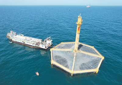 4月16日,青岛国家深远海绿色养殖试验区,养殖工船停靠在“深蓝1号”网箱旁进行收鱼作业。
