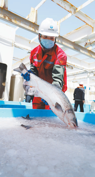 4月16日,大西洋鲑被吸鱼泵吸入养殖工船后,工作人员进行速冻处理。 4月16日清晨,在我国黄海离岸120多海里的青岛国家深远海绿色养殖试验区,一场收鱼行动即将开始。 8时许,伴随着“哒哒”的马达声,山东海洋集团的养殖工船缓缓驶近全潜式深海渔业养殖装备“深蓝1号”。锚定完毕后,养殖工船尾部起重臂旋转,将一根吸鱼泵递出,继而伸进“深蓝1号”网箱内部,刹那间,一条条活蹦乱跳的大西洋鲑被“吸”上了工船。 大西洋鲑是三文鱼的一种,主要分布在高纬度的北大西洋和北太平洋海域。受气候等因素影响,我国大西洋鲑长期依赖于进口。2018年7月,作为山东“海上粮仓”重点建设项目,“深蓝1号”正式启用,目前已实现大西洋鲑低纬度深海规模化养殖。 “这批大西洋鲑单鱼平均重量超过5千克,品质达到欧盟出口标准,收鱼工作预计持续到月底。”山东海洋集团深远海绿色养殖有限公司首席运营官吴济红介绍,“从打捞上船开始计算,12个小时内,这批大西洋鲑就能从深海走上餐桌。” “‘深蓝1号’直径60米,重约1400吨,养殖水体达5万立方米,设计研发突破了沉浮控制、鲨鱼防护等多项关键技术,同时配备摄像头、传感器等,打造了智慧化的养殖集控管理系统。”吴济红说,工作人员坐在办公室,通过一块大屏就能实时掌握设备运行状态、投喂量、投喂次数等信息。 “此次‘深蓝1号’获得丰收,标志着青岛国家深远海绿色养殖试验区由试验阶段迈入生产阶段。未来,我们将持续拓展海水养殖发展空间,打造百亿元级深远海绿色养殖产业集群,促进水产养殖转型升级、高质量发展。”青岛西海岸新区海洋发展局党组书记、局长赵英民说。 |