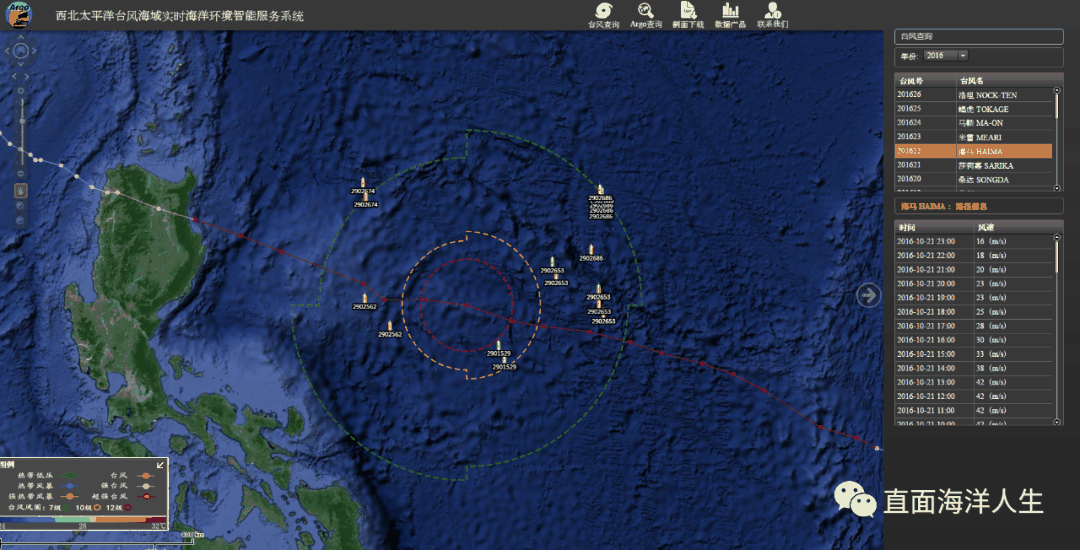 如对某个感兴趣的台风轨迹点,用户可快速查询到前后10天附近海域300公里范围内的浮标分布,并可显示相应浮标的动态漂移轨迹;同时,还可以把最近时刻的SST大面分布进行叠加显示分析。