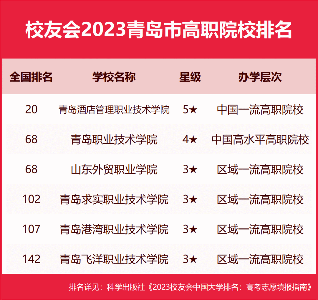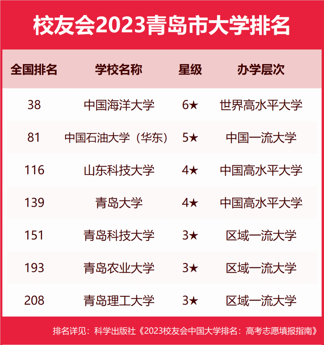 中国海洋大学勇夺2023青岛市大学排名冠军 在最新校友会2023中国大学排名中,中国海洋大学综合实力最强、办学水平最高、最具竞争力,全国排名第38名,位居校友会2023青岛市大学排名榜首。中国石油大学(华东)名列全国第81名,高居第2名。山东科技大学位居全国第116名,名列第3名。青岛大学高居全国第139名,位列第4名。青岛科技大学位居全国第151名,名列第5名。青岛农业大学排行全国第193名,高居第6名。青岛理工大学位列全国第208名,位居第7名。 青岛电影学院勇夺2023青岛市民办大学排名第一 在最新校友会2023中国民办大学排名中,青岛电影学院办学实力最强、最具竞争力、办学水平最高,全国排名第12名,稳居校友会2023青岛市民办大学排名第一。青岛滨海学院位列全国第23名,位居第2名。青岛工学院排行全国第31名,名列第3名。青岛黄海学院排名全国第43名,位列第4名。青岛恒星科技学院位列全国第53名,排名第5名。青岛城市学院排名全国第76名,排名第6名。 青岛酒店管理职业技术学院位居2023青岛市高职院校排名第一 在最新校友会2023中国高职院校排名中,青岛酒店管理职业技术学院办学水平最高,全国排名第20名,名列校友会2023青岛市高职院校排名榜首。山东外贸职业学院、青岛职业技术学院位居全国第68名,位居第2名。青岛求实职业技术学院排行全国第102名,排行第4名。青岛港湾职业技术学院位列全国第107名,位居第5名。青岛飞洋职业技术学院位列全国第142名,高居第6名。