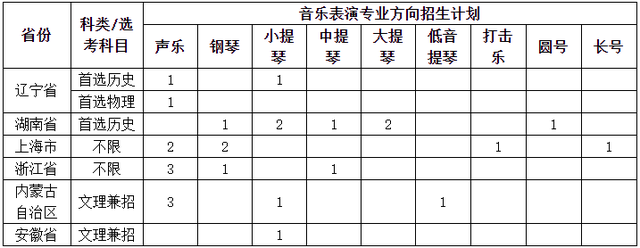 录取原则: 实行平行志愿的省份,按照投档成绩从高到低排序择优录取。实行非平行志愿的省份,按照专业统考成绩从高到低排序择优录取。 14.厦门大学 招音乐表演共75人 招音乐学共30人 录取原则: (1)音乐学专业,对于实行平行志愿投档的批次,我校录取时按照当地省级招生部门确定的投档规则从高分到低分进行录取。若不实行平行志愿投档,则以考生的综合分择优录取。综合分以750分为满分计算,考生综合分=考生高考文化投档成绩÷高考总分×750×50%+考生专业省统考成绩÷专业省统考总分×750×50%。 15.西南交通大学 招音乐表演共60人 录取原则: 进档考生按照总分从高到低、声乐和器乐分别单独排序录取。如省级招生管理部门投档时,无法区分声乐和器乐,则合并声乐和器乐的招生计划,按照合并后的招生计划总数,以总分从高到低排序录取。 16.山东大学(威海) 招音乐学共57人 (1) 西洋弦乐与打击乐表演方向 (2)西洋管乐表演方向 (3)民族器乐方向 (4)键盘方向 (5)声乐方向 录取原则: 考生高考文化成绩(含政策加分,下同)须达到所在省份艺术类本科合格线,在进档考生中,按分数优先原则根据专业统考成绩(山东省音乐类专业为按我校办法计算的专业成绩)排序录取。 17.吉林大学 招音乐表演共58人 录取原则: 在投档到我校的考生中,根据分省计划及招考方向,按专业省统考成绩从高分到低分择优录取。 18.东北大学 招音乐表演共60人 录取原则: 要求考生专业省统考合格,高考文化课成绩达到我校在该省所在批次同科类艺术类控制分数线,按专业统考成绩分省分专门化排序,择优录取。 19.苏州大学 招音乐学(师范) 20.安徽大学 招音乐表演共30人 录取原则:报考我校的考生按各省招生文件规定的投档原则和投档比例予以投档。 21.兰州大学 招音乐表演共32人