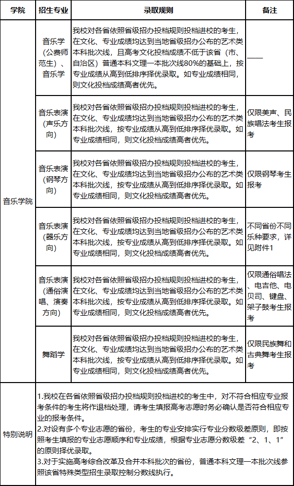 录取原则: 在考生达到本简章相关要求的情况下,生源省份明确要求按其规定规则进行投档的省份,按其规定进行投档和录取;允许高校自设投档规则的省份,按照综合成绩由高到低录取,综合成绩=(专业统考成绩/专业统考满分值)×70+(高考成绩/高考满分值)×30。 声乐方向:高考文化课分数不低于375分,同时符合教育部和各省区相关规定。 器乐方向:高考文化课分数不低于375分,同时符合教育部和各省区相关规定。 22.郑州大学 招音乐表演共136人,招音乐学共64人 录取原则: 23.宁夏大学 招音乐学(师范)共95人 录取原则: 24.中国石油大学(华东) 招音乐学共40人 录取原则:根据生源所在省级招生考试机构投档规则,对于专业成绩、高考文化课成绩达到我校“报考要求”的进档考生,我校将根据各招考方向的招生计划,依据专业统考成绩从高到低择优录取。 25.石河子大学 招音乐学(师范)共50人。 26.西南大学 招音乐学(公费师范生)、音乐学、音乐表演