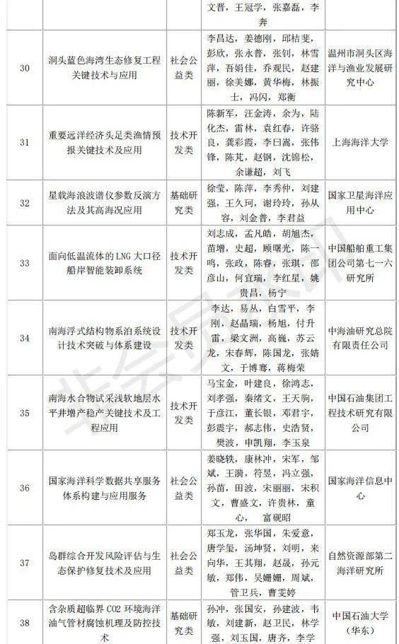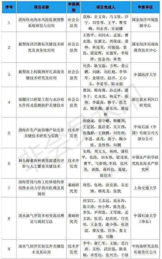 备注:表中”项目完成人”为申报项目所有项目完成人,“申报单位”为申报项目第一完成单位。按照《海洋工程科学技术奖管理办法》,各项目授奖单位和完成人数量,复审后依据各项目的获奖等级确定。