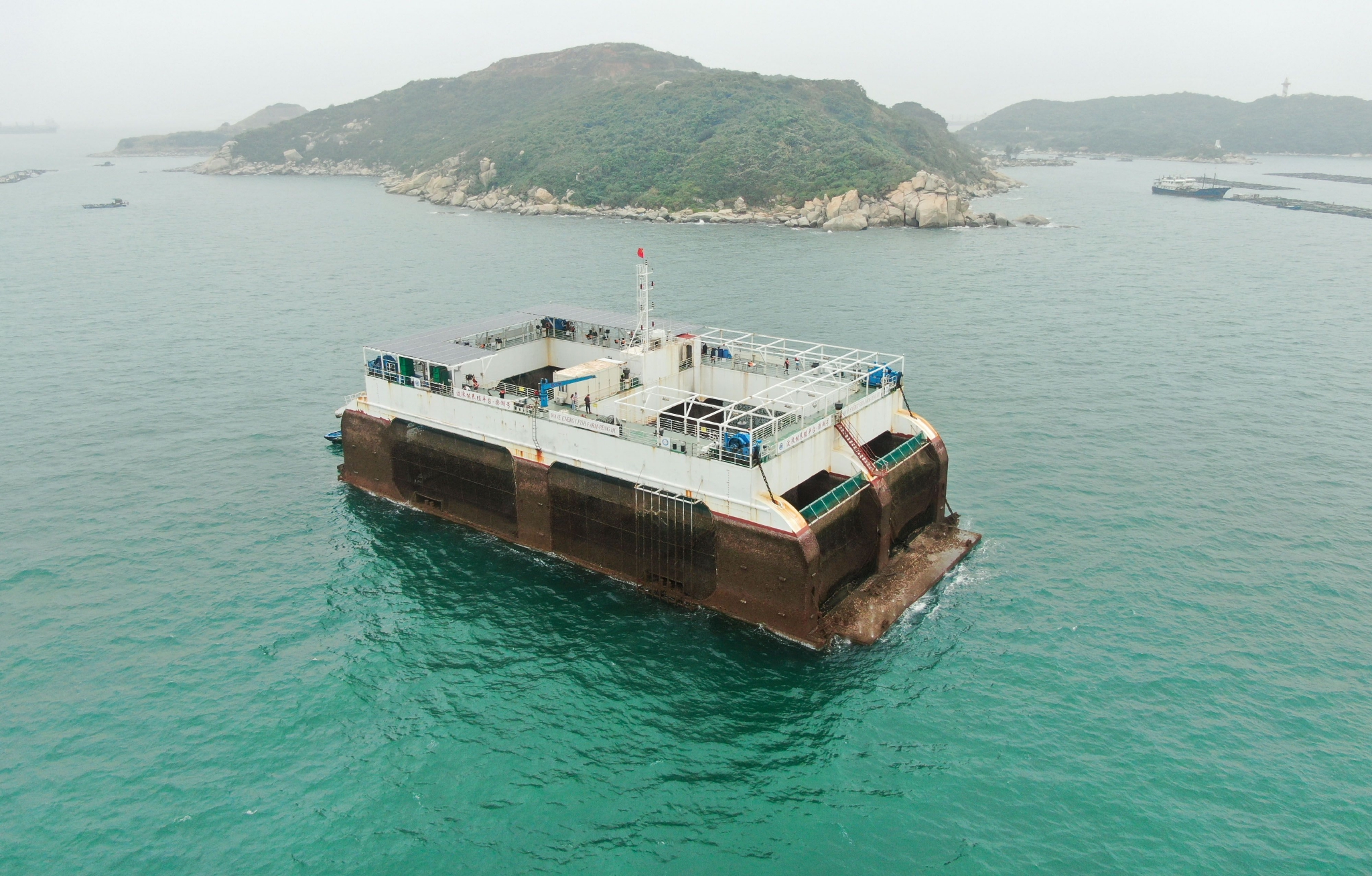 这是在广东珠海万山海域拍摄的中国首台半潜式波浪能养殖旅游平台“澎湖号”(4月25日摄,无人机照片)。 新华社记者 邓华 摄