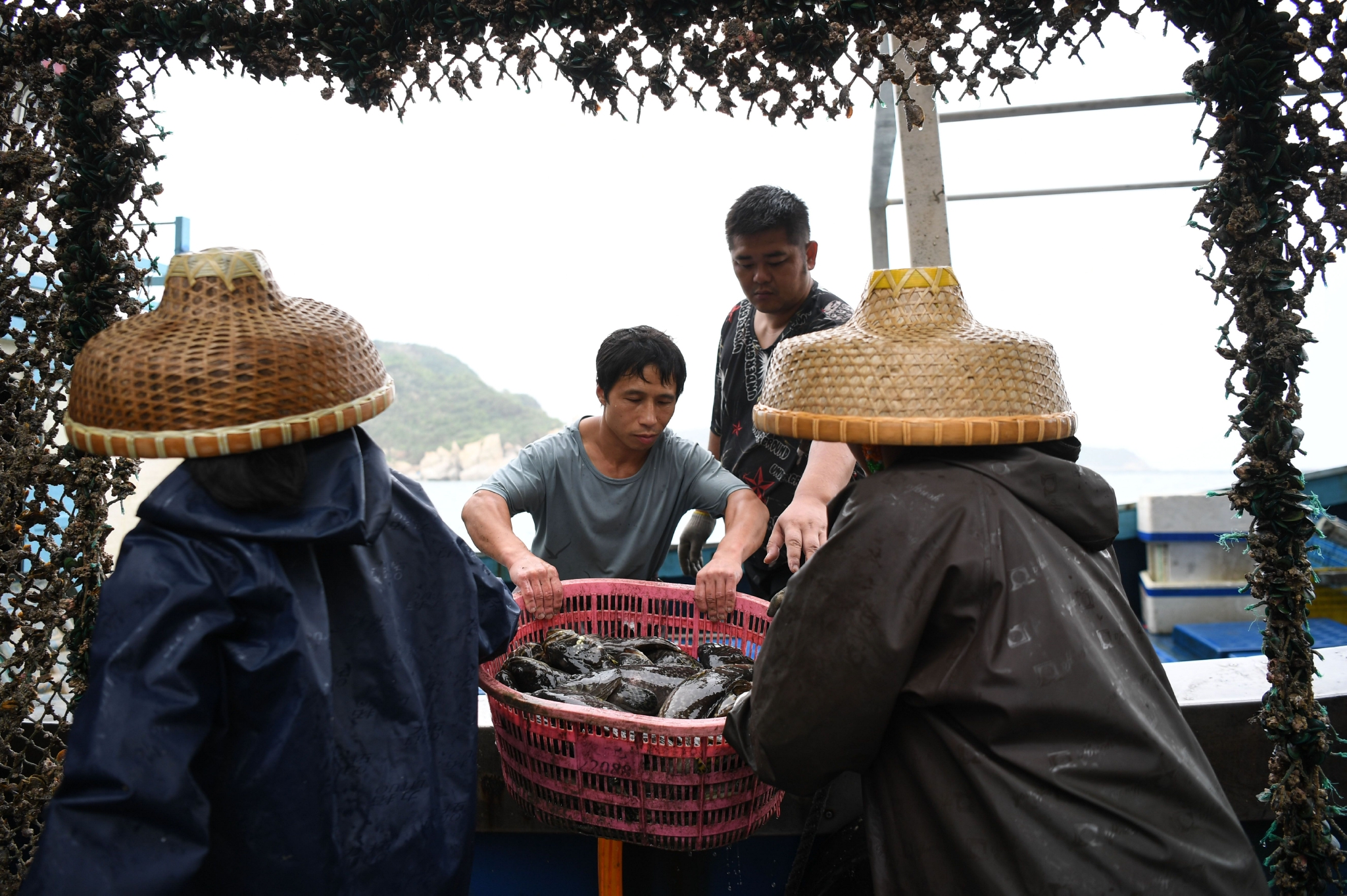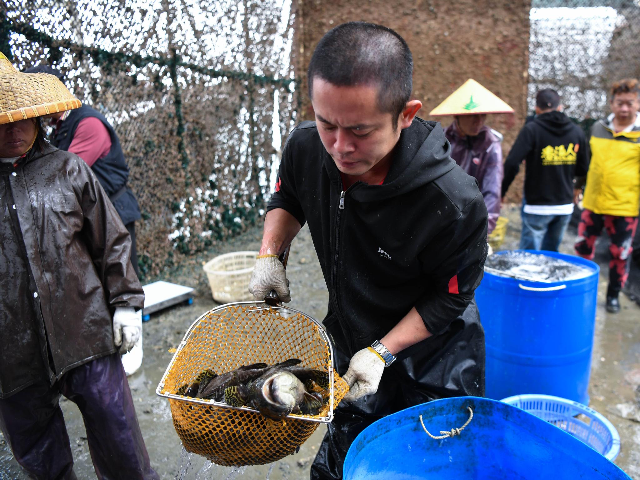 在广东珠海万山海域,中国首台半潜式波浪能养殖旅游平台“澎湖号”上,工作人员装载刚捕捞的石斑鱼(4月25日摄)。 新华社记者 邓华 摄 |