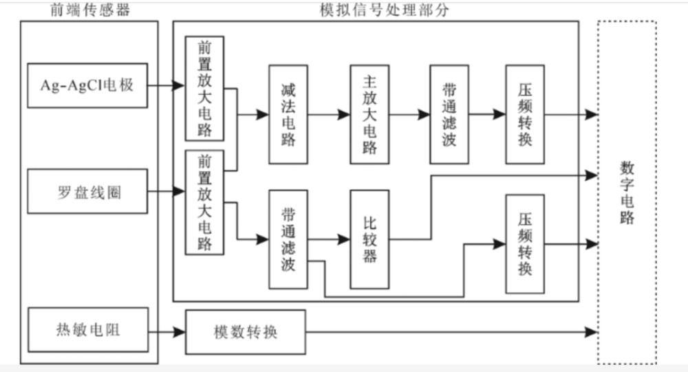 图1???海水流动方向示意图(据文献[14]修改) 由于海水在竖直方向上没有形成闭合回路,在Bx引起的洛伦兹力Fz作用下带电正离子在海底堆积,带电负离子在海面堆积,在z轴上形成一个向上的电场。该电场施加与洛伦兹力方向相反的力给正离子,达到平衡。因此垂直于海平面的电流密度为0。电场强度Ez为: Ez=Fz/q=-VyBx? ? ? ? ? ? ? ? ? ? ? ? ? ? ? ? ? ? ? ? ? ? ? ? ?(1) 其中:q为带电正粒子的电荷量,Vy为海水的流动速度。 以海平面的电势为零点,则海中与海面的感应电动势Δφ为: 在Bz作用下,海水中带电正离子受到的洛伦兹力沿x轴方向,其电场强度Ex为: Ex=VyBz? ? ? ? ? ? ? ? ? ? ? ? ? ? ? ? ? ? ? ? ? ? ? ? ? ? ? ? ? ??(3) 但是与垂直海平面方向的z轴不同的是,海水在水平方向形成闭合回路,因此沿x轴方向电流密度δx为: δx=γVyBz? ? ? ? ? ? ? ? ? ? ? ? ? ? ? ? ? ? ? ? ? ? ? ? ? ? ? ? ? ??(4) 其中,γ为海水电导率。 假设海水的流动只存在于海表面,则理想化的海流流速Vy为[14]: 其中:z为当前海流所在深度;z1、z2为水下的某一深度,z2的深度大于z1;z2以下海水的流速为0,z1以上海水的流速为V0。 一般情况下Bx是一个常量,则电位分布U为: 1.2 XCP测量原理 通过两个间距为L的电极作为传感器测量海流感生电动势。建立以东为x轴,北为y轴,向上为z轴的坐标系,令感生电场的测量方向与y轴存在一个夹角θ,电极两点中测得的感生电动势Δφ1为: 分别为海流的东、北方向分量及其平均速度。 由此可知,待测电压与电极距离L、海流的相对速度V-v?成正比。通过测量Δφ1可测得海流的相对速度,因实际中v不易确定,所以一般测量结果都是以相对速度的形式表现[4-5,14]。 2 XCP模拟电路设计 XCP的电路部分分为数字电路部分与模拟电路部分,本文主要研制模拟电路部分,分为前端传感器、模拟信号处理部分、模数转换、压频转换及电源部分等。前端传感器及模拟信号处理部分整体框图如图2所示。