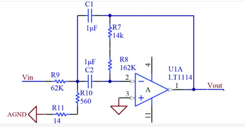 图3???减法电路示意图 考虑到电极信号与罗盘线圈信号均为16 Hz左右的信号,在放大电路的前端加入RC无源低通滤波器进行简单的滤波,后续信号处理电路中加入中心点为16 Hz的二阶带通滤波电路,在允许16 Hz信号通过的同时滤除其他频段的干扰,提升信号质量。滤波电路部分如图4所示。