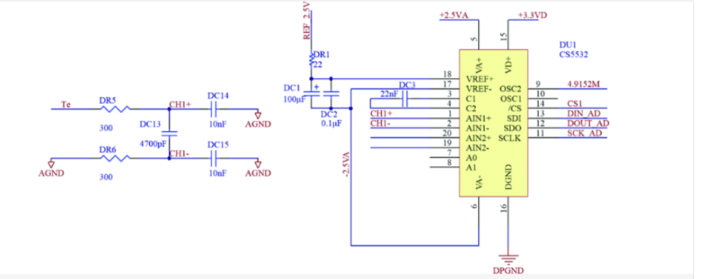 图4???滤波电路示意图 2.3 模数转换及压频转换部分 模数转换电路采用了24位高精度AD芯片CS5532,主要用于接收温度信号并将其转换为数字信号。CS5532是由Cirrus Logic公司推出的极低噪声、多通道的Δ-Σ型模拟/数字转换器。该芯片具有2个通道,可测量2个差分信号,内部集成可编程增益斩波放大器与一个四阶Δ-Σ调制器,具有精度高、动态性能宽的特点。其内部集成有自校正系统,具有消除模数转换芯片的零点增益与漂移误差的功能。模数转换电路如图5所示。