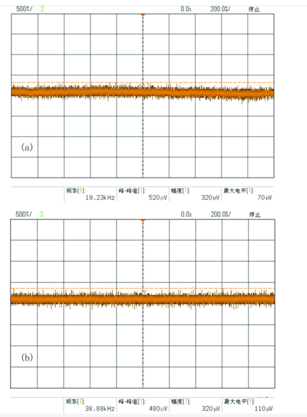 图5???模数转换电路原理图 比较器电路采用了LM393DR芯片。LM393DR是双路电压比较器集成电路,由两个独立的精密电压比较器构成,具有高增益、低功耗的特点,通过比较两路输入电压改变输出电压的高低。线圈信号经电压比较器处理后输出给数字电路部分进行信息提取。 压频转换电路采用了AD650芯片。AD650是美国Analog Devices公司推出的高精度电压频率(V/F)转换器,具有体积小、精度高且外围电路简单等优点。电极信号与罗盘线圈信号经压频转换电路处理后输出给数字电路部分进行处理。 2.4 电源部分 模拟电路采用锂电池供电,其供电电压为3.7~4.25 V。正压部分由锂电池直接供电,经由LTC3426输出给LT1962生成系统所需5 V与2.5 V电源。LT1962是一款低噪声LDO,其最大可以提供300 mA输出电流,内部集成有保护、限流等电路。负压部分采用MAX764生成。MAX764是美信公司生产的一款高效、低功耗、宽电压输入范围的DC-DC,静态电流仅120 μA,通过调节外部电阻的大小调节输出电压。由于MAX764为开关电源,其电源纹波过大,因此采用LT1964生成系统所需-5 V与-2.5 V电源。LT1964是一款低噪声LDO,其输出电压范围为-20~-1.22 V,具有低噪声、低功耗、低压差等特点,其电流最大输出为200 mA。 3 测试 对模拟电路进行测试,验证电路是否满足设计需求。本文主要介绍电源纹波测试、模拟电路放大倍数测试以及电压比较器电路测试。 3.1 电源纹波测试 电源纹波是衡量电路工作的重要指标之一,图6所示为系统电源纹波测试结果,可以看出,系统工作时放大器的供电电源噪声在0.5 mV左右。