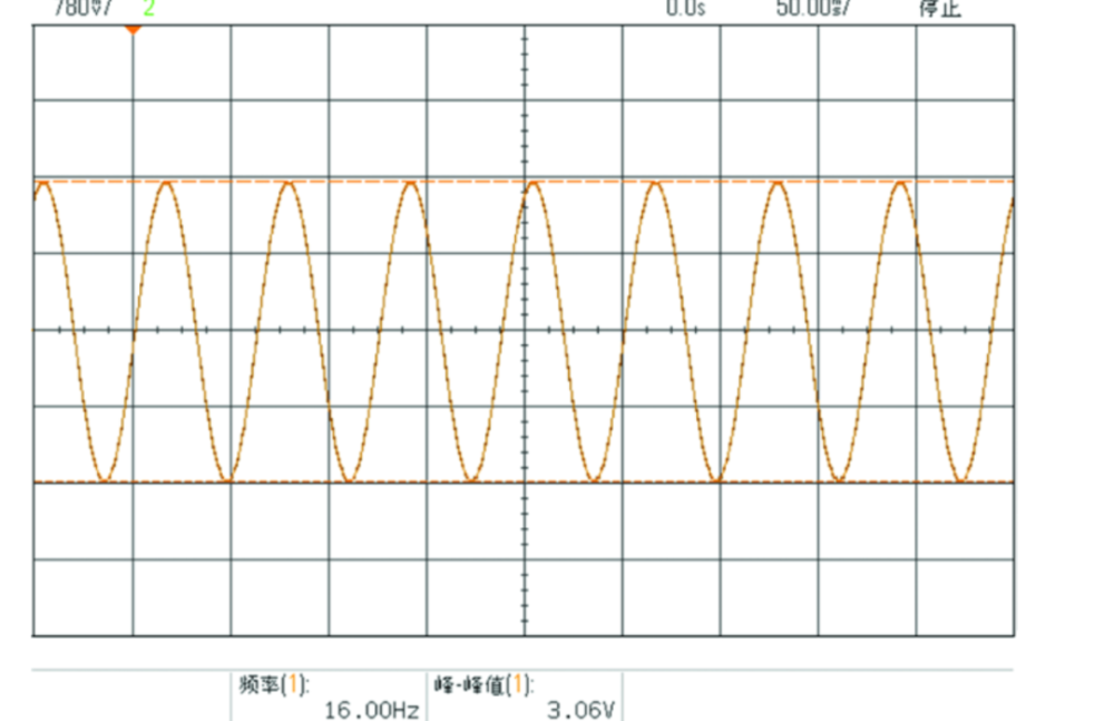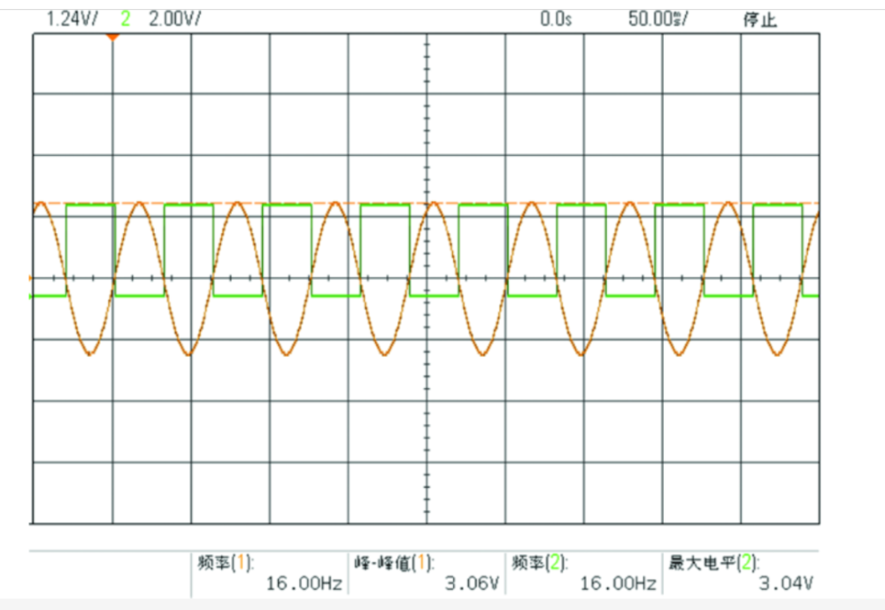 图8???线圈通道输出波形 3.3 电压比较器电路测试 信号经电压比较器后输出脉冲信号给后续数字电路进行处理,测试结果如图9所示。通道1所示正弦波为16 Hz输入信号,通道2所示方波为经过电压比较器后输出的脉冲信号。由图9可知两路信号为同频信号,方波峰峰值控制在2.8~3.3 V之间,方便后续数字电路部分进行处理。