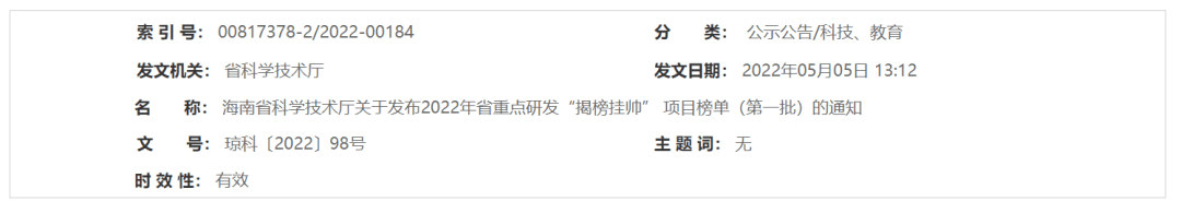 海南省科学技术厅关于发布2022年省重点研发“揭榜挂帅” 项目榜单(第一批)的通知 各有关单位: 为深入贯彻落实省委、省政府关于实施创新驱动战略的有关要求,深化科技体制改革,创新科研项目组织管理方式,推动解决海南产业发展中的技术难题,加快科技成果转化与产业化。根据《海南省科技项目揭榜挂帅制实施方案》相关要求,海南省科学技术厅在向社会公开征集的基础上遴选了一批“揭榜挂帅”科技项目需求,现将榜单予以发布,具体事项通知如下。 一、申报范围 详见附件《2022年省重点研发“揭榜挂帅”项目榜单(第一批)》。 二、揭榜流程 (一)有意向的揭榜方应结合张榜项目具体需求及自身能力,在榜单发布后主动与发榜方对接洽谈(发榜方联系方式请与省科技厅对口业务处室对接获取),细化落实合作具体内容,达成共识;发榜方、揭榜方按有关规定签订技术合同,并共同制定发榜项目的实施方案(按省重点研发项目申报书格式填写)。 (二)达成合作的项目须通过海南省科技业务综合管理系统——新系统入口(http://202.100.247.126/egrantweb/)网上填报,填写项目申报书,并上传技术合同等相关附件。申报流程为: 1.注册帐号。揭榜方首次申报省级科技项目,需登陆海南省科技业务综合管理系统,点击“注册”,按照提示完成注册流程。每个单位只能注册一个“单位管理员”帐号(“单位管理员”帐号不能直接申报项目),“单位管理员”帐号可以创建本单位“项目申报人”帐号,本单位的“项目申报人”帐号由单位管理员统一管理。已在本系统注册的单位或人员可以直接使用原账号登陆,不需要重新注册。 2.在线填写。项目申报人登录系统后按支持方向(高新技术、社会发展、现代农业)在线填写《海南省重点研发项目申报书》,项目遴选方式选择:揭榜挂帅。并在附件栏上传相关材料,确认无误后在线提交至本单位管理员进行审核。 3.在线审核。申报单位管理员审核申报材料,确认无误后,在管理系统内提交省科技厅。 4.项目修改。项目申报期内,项目申报人可向业务主管处室申请撤回或修改完善,经申报单位管理员审核后,重新提交至省科技厅。 (三)海南省科学技术厅对签订技术合同成功揭榜的“揭榜挂帅”项目进行可行性论证,提出拟支持项目名单及补助金额,经向社会公示无异议的项目,省科技厅及时发布立项通知。 (四)省科技厅将揭榜制项目列入省重点研发项目进行管理,并按有关规定与发榜方、揭榜方签订科技计划项目任务书。 (五)本批“揭榜挂帅”项目网上申报截止时间为2022年6月23日,请提前做好项目申报工作,避免集中造成拥堵。 三、相关要求 (一)“揭榜挂帅”项目按照《海南省科技项目揭榜挂帅制实施方案》(琼科〔2021〕110号)和《海南省重点研发专项和经费管理暂行办法》(琼科规〔2021〕18号)相关规定组织实施。 (二)榜单申报“不设门槛”,项目牵头申报和参与单位无注册时间要求,项目负责人无年龄、学历和职称要求,鼓励有信心、有能力组织好关键核心技术攻坚的优势团队积极申报。联合申报单位不超过4家(含牵头单位)。 (三)“揭榜挂帅”项目申报单位和项目负责人不受承担的省级科技专项在研项目数量限制;在申报其他省级财政科技专项项目时,所申报的揭榜挂帅项目不计入限项数量。 (四)揭榜方(含合作单位)与发榜方不能为同一单位或其关联单位。 (五)资助方式 1.企业作为发榜方的项目,资助方式按照《海南省科技项目揭榜挂帅制实施方案》执行。 2.省政府相关行业管理部门、市县政府、重点园区作为发榜方的“揭榜挂帅”项目,省级财政资金支持方式包括前补助和后补助。 (1)对于高等院校、科研院所或其他事业单位牵头揭榜的项目,实行前补助资助方式。项目立项后,省级财政资金一次性拨付项目牵头单位。 (2)对于企业单位牵头揭榜的项目,采取事前立项事后补助方式。项目立项后,按照不超过财政资助总经费的50%,拨付项目牵头单位。在项目验收通过后,再根据项目完成和资金使用情况给予相应补助。 (3)项目牵头单位按照项目研究进度,根据项目负责人意见,及时将财政资金拨付至项目参与单位。项目参与单位不得再向外转拨资金。 3.企业、市县政府、重点园区等补助资金拨付按照发榜方、揭榜方技术合同约定的拨付方式执行。 四、联系方式 申报系统技术咨询:65389015; 业务咨询: 高新技术方向:65323068; 现代农业方向:65342626; 社会发展方向:66290357。 附件: 1-2022年省重点研发“揭榜挂帅”项目榜单(第一批).doc 2-海南省科技项目揭榜挂帅制 实施方案.pdf 3-海南省重点研发专项和经费管理暂行办法.pdf 4-海南省重点研发项目申报书模板.doc 5.技术开发(委托)合同模板.doc 海南省科学技术厅 2022年5月5日 (此件主动公开) 2022年省重点研发“揭榜挂帅”项目榜单(第一批) 为落实省委、省政府科技工作部署,充分利用省内外科技资源攻克制约海南产业发展的技术难题,探索、积累揭榜挂帅制度实施经验,结合我省实际,凝练形成2022年度省重点研发“揭榜挂帅”项目榜单(第一批),现将榜单任务及有关要求予以发布。 一、技术攻关类 (一)高新技术 项目1.近海船舶“精智联控一体化”作战体系及示范应用 研究内容:精准识别海上目标研究,具备船舶特征识别能力,实现雷达、光电、AIS、北斗、视频、卫星等多种数据融通、多种系统联