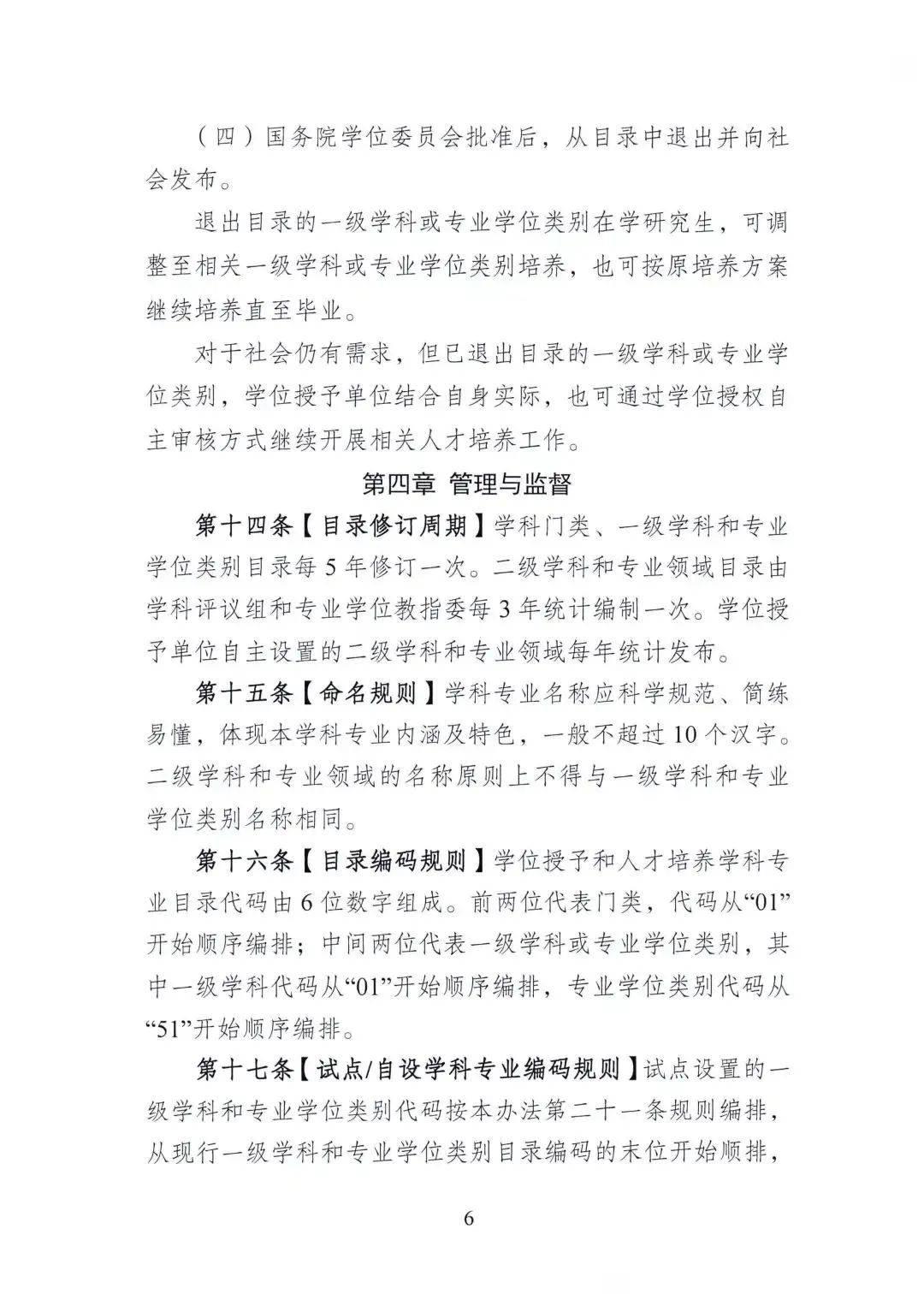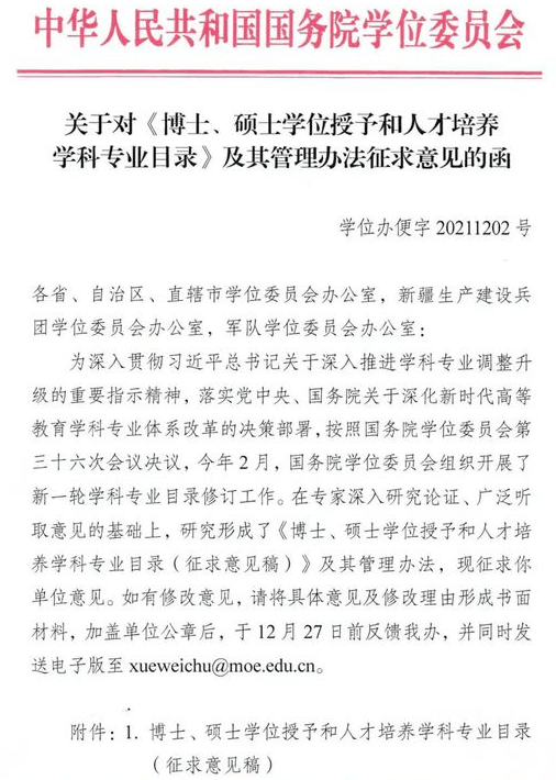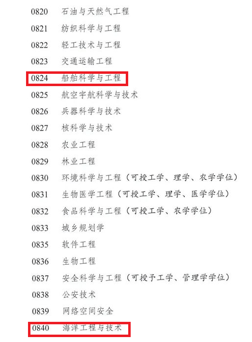 近日,国务院学位委员会下发《博士、硕士学位授予和人才培养学科专业目录(征求意见稿)》,经过新一轮学科专业目录修订工作,面向各省市学位委征求意见。 相比目前使用的2018年学科专业目录,新版目录中,法医学有了一级学科,戏曲与曲艺、美术与书法有了专业学位,目录同时明确了交叉学科的一级学科。新目录与原目录相比,增加了交叉学科学科门类,授予学位的学科门类增加到14个。 新增的交叉学科门类中,有6个一级学科,除了熟悉的集成电路科学与工程、国家安全学之外,还有设计学、遥感科学与技术、智能科学与技术、区域国别学等。 具体来说,哲学学科门类新增了应用伦理专业学位;经济学学科门类中,一级学科理论经济学和应用经济学合并为经济学一级学科。同时,新增了数字经济,但仅可授硕士专业学位;法学学科门类新增了中共党史党建、纪检监察学两个一级学科,知识产权、国际事务两个专业学位;历史学学科门类中,文物与博物馆单列为文物、博物馆2个专业学位。农学学科门类新增了水土保持与荒漠化防治学一级学科;医学学科门类增加了法医学一级学科,还新增了针灸专业学位。另外,临床医学、口腔医学、药学明确学术学位与专业学位并存,本科之后考研具体是学硕还是专硕,还要看个人的发展需求。 这次艺术学科门类中的艺术学一级学科涵盖了音乐、舞蹈、戏剧、影视、美术设计等历史、理论研究方向。同时,以往的音乐与舞蹈学列为音乐、舞蹈两个单独的专业学位,还增设了戏曲与曲艺、美术与书法等专业学位。 当然,我们最关心的还是工学学科,本次工学学科门类下共增加了64个学位点,是专业增加最多的学科。我们大家比较关心的海洋方向,则把原来的“船舶与海洋工程”学科拆分为:船舶科学与工程和海洋工程与技术两个专业学位点,编号分别为0824和0840,侧重为船舶科学与海洋技术两个方向布局。 同时,在测绘方向继续保留“测绘科学与技术”一级学科。   用专业精神创造价值 用人文关怀引发共鸣 您的关注就是我们前行的动力
