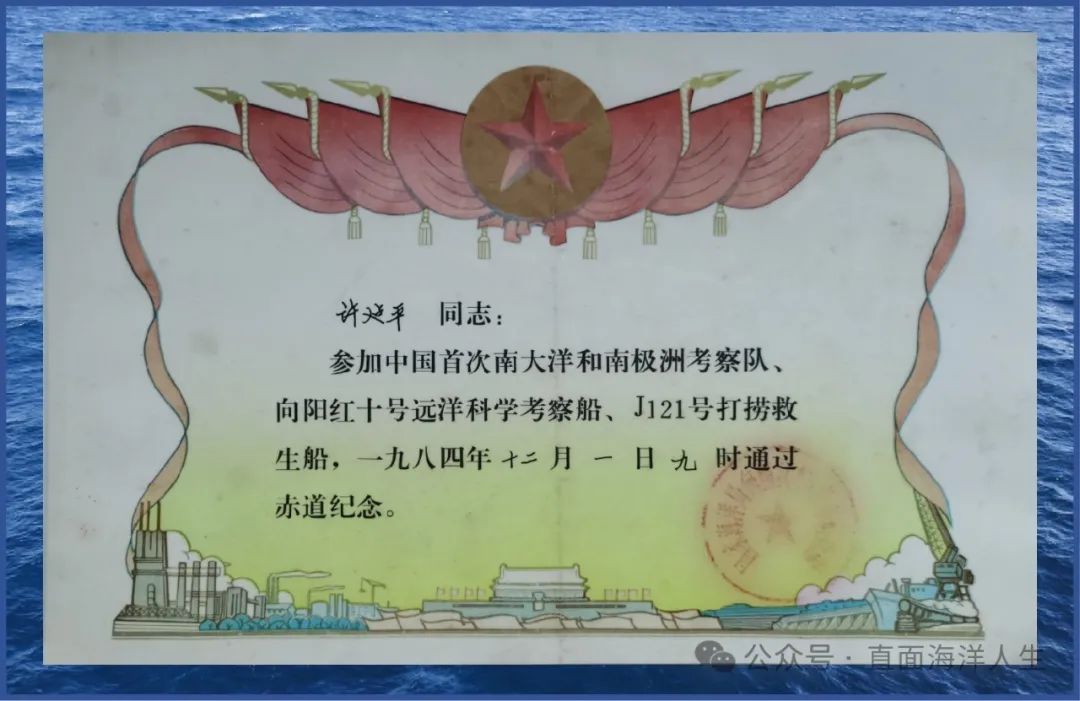 他们头戴印有“中国”两字的红色帽子,个个喜气洋洋。随着几颗红绿信号弹升空,担任这次考察总指挥的陈德鸿副局长向全体考察队员宣布了过赤道的精确时间,并向每个人颁发了“过赤道纪念证书”。