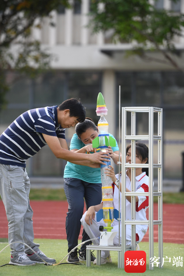 人大附中三亚学校的学生进行水火箭发射。记者沙晓峰摄