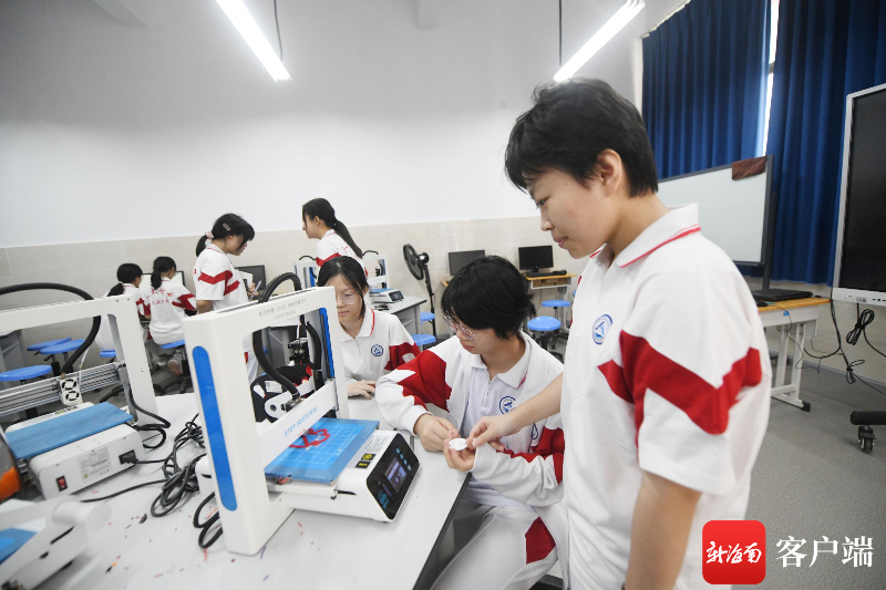 学生在人大附中三亚学校的3D打印实验室内体验3D打印。记者沙晓峰摄 “为满足学生个性发展需求,我们开设了种类齐全,覆盖小学、初中、高中的‘生长力课程’。”校长宓奇介绍,人大附中三亚学校是一所设有小学、初中、高中及国际课程班的12年级全日制公立学校,目前,学校设66个班级共2700多名学生。“生长力课程”有机融合了国家课程、地方课程、校本课程,涵盖语言与文化、数学与科学、人文与社会、技术与设计、艺术与欣赏、体育与健康、德育与心理、劳动实践等多个领域共一百多门特色课程,进一步促进学生全面发展和特长发展。