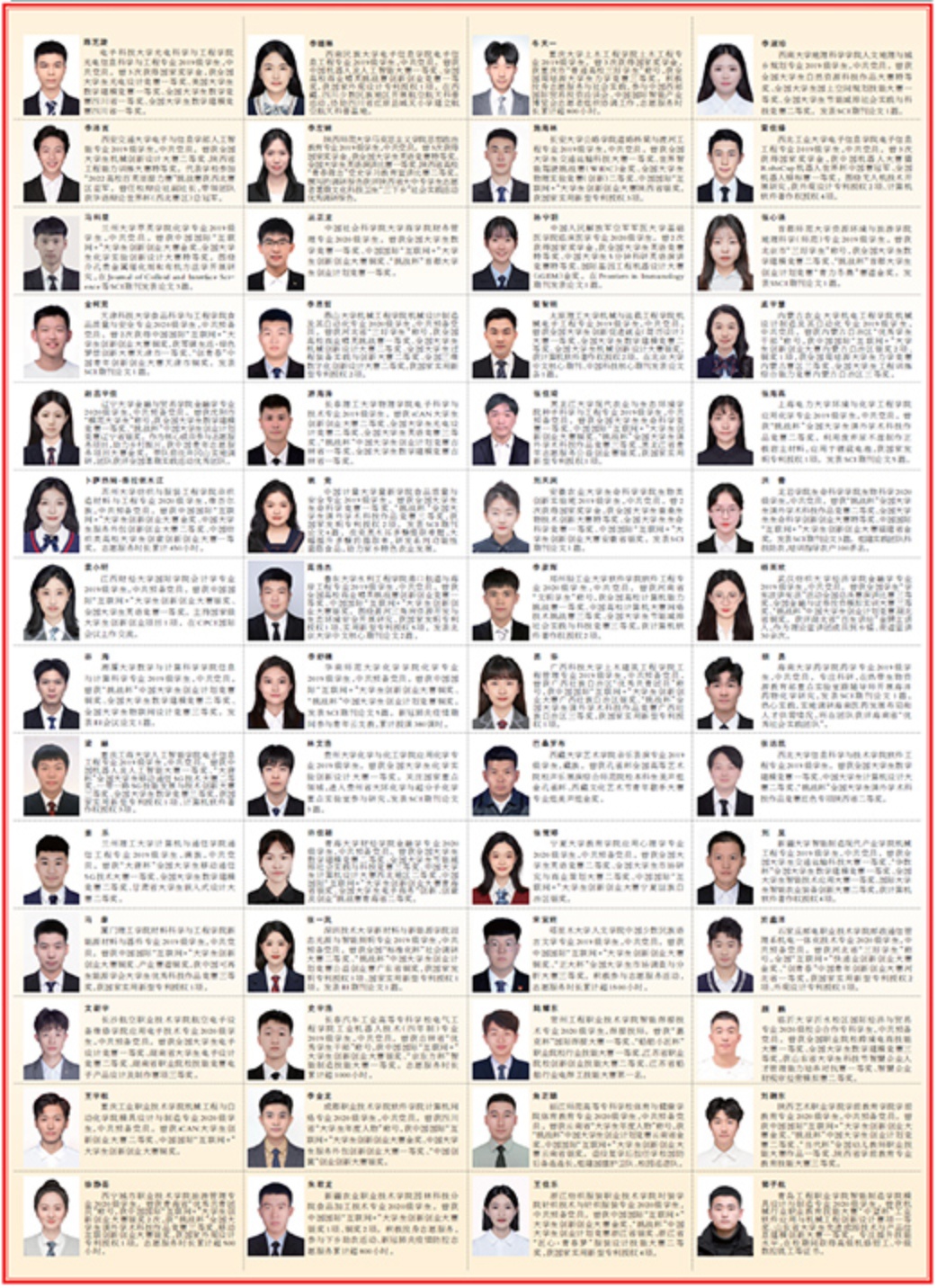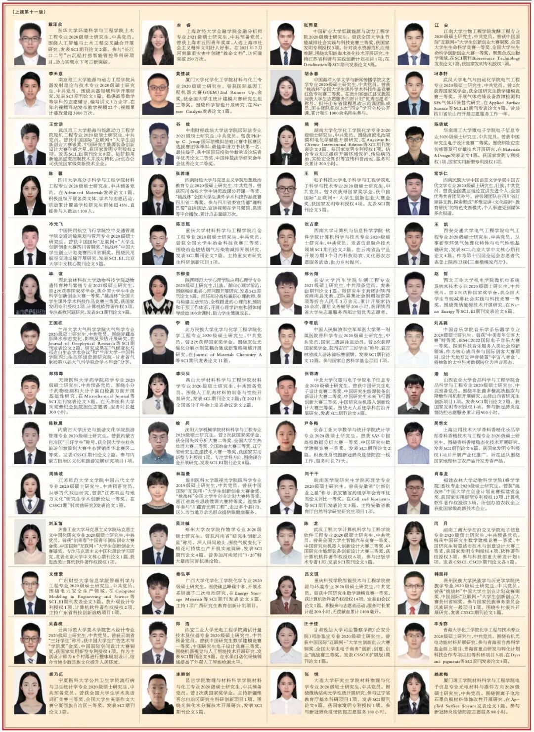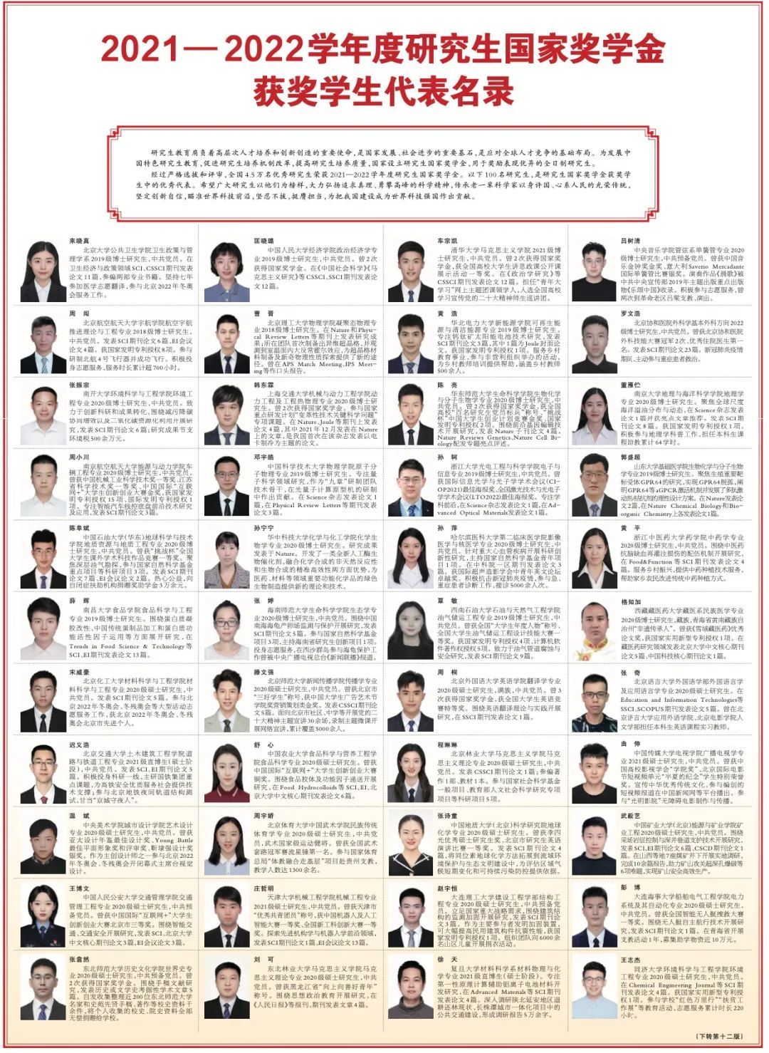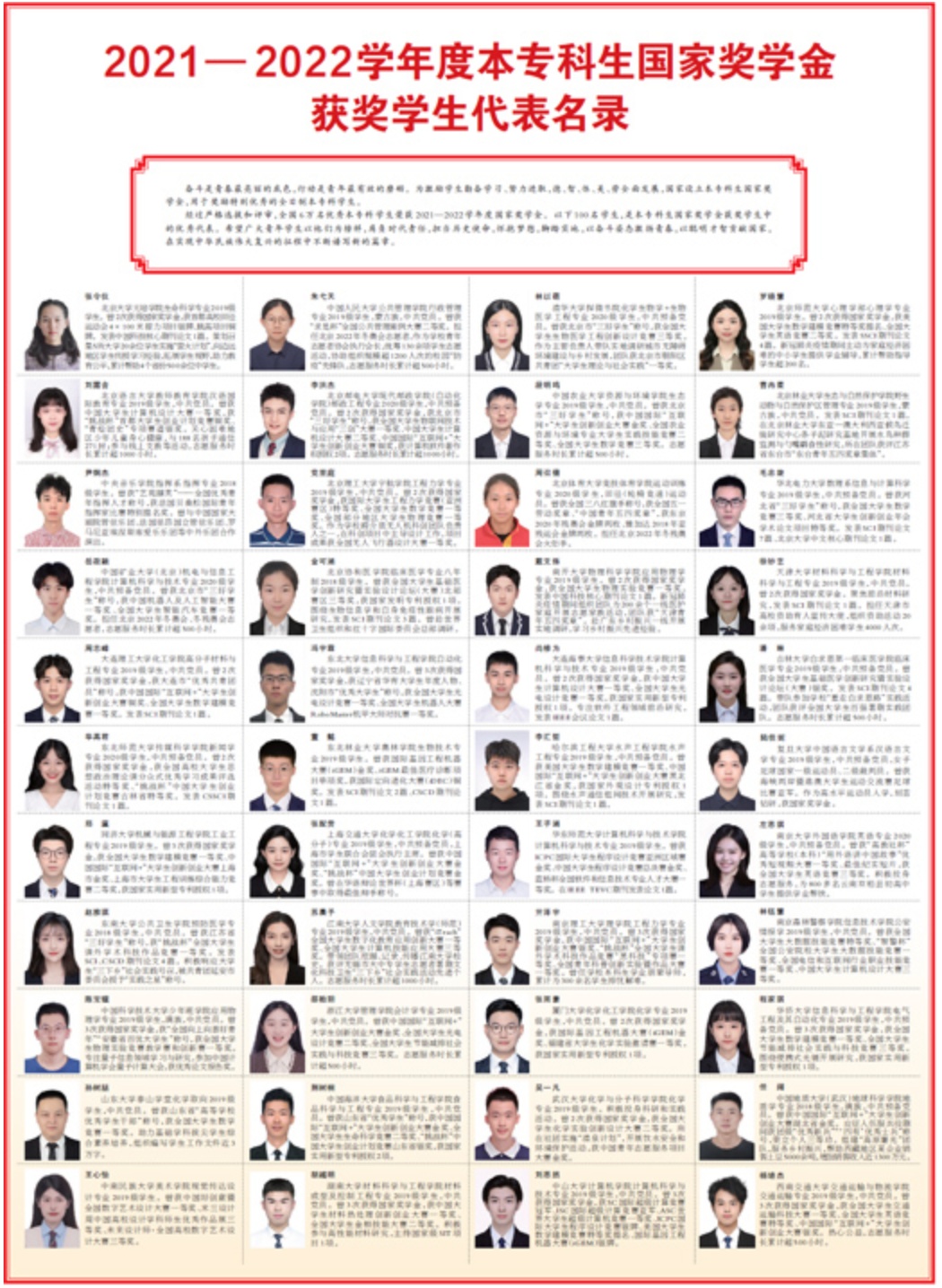 研究生教育肩负着高层次人才培养和创新创造的重要使命,是国家发展、社会进步的重要基石,是应对全球人才竞争的基础布局。为发展中国特色研究生教育,促进研究生培养机制改革,提高研究生培养质量,国家设立研究生国家奖学金,用于奖励表现优异的全日制研究生。 经过严格选拔和评审,全国4.5万名优秀研究生荣获2021—2022学年度研究生国家奖学金。以上100名研究生,是研究生国家奖学金获奖学生中的优秀代表。希望广大研究生以他们为榜样,大力弘扬追求真理、勇攀高峰的科学精神,传承老一辈科学家以身许国、心系人民的光荣传统,坚定创新自信,瞄准世界科技前沿,坚忍不拔,挺膺担当,为把我国建设成为世界科技强国作出贡献。 江苏省共6名学生入选《2021—2022学年度研究生国家奖学金获奖学生代表名录》,他们是:南京大学董雁伫、南京航空航天大学周小川、中国矿业大学张同星、江南大学江安、南京理工大学李天意、江苏师范大学周姝岐。 南京大学董雁伫 南京大学地理与海洋科学学院地理学专业2020级博士研究生。聚焦全球尺度海洋溢油分布与动态,在Science杂志发表论文1篇并获亮点文章推荐。发表SCI期刊论文8篇。获国家发明专利授权1项。积极参与地理学科普工作,担任本科生课程助教累计64学时。 南京航空航天大学周小川 南京航空航天大学能源与动力学院车辆工程专业2020级博士研究生,中共党员。曾获中国机械工业科学技术奖一等奖、江苏省科学技术奖一等奖、中国国际“互联网+”大学生创新创业大赛金奖,获国家发明专利授权15项、国际发明专利授权1项。专注智能汽车线控底盘前沿技术研究及应用,发表SCI期刊论文3篇。 中国矿业大学张同星 中国矿业大学低碳能源与动力工程学院2020级硕士研究生。曾获全国大学生节能减排社会实践与科技竞赛三等奖,获国家发明专利授权3项。针对淡水资源危机治理难题,围绕太阳能海水淡化技术开展研究,主持江苏省科研与实践创新计划项目1项;在Desalination等SCI期刊发表论文5篇。 江南大学江安 江南大学生物工程学院发酵工程专业2020级硕士研究生,中共党员。曾获中国国际“互联网+”大学生创新创业大赛铜奖、全国大学生生命科学竞赛一等奖、全国大学生生命科学创新创业大赛一等奖。聚焦合成生物学领域,在SCI期刊Bioresource Technology发表论文1篇,获国家发明专利授权1项。 南京理工大学李天意 南京理工大学能源与动力工程学院兵器发射理论与技术专业2020级硕士研究生,中共党员。围绕兵器领域科学开展研究,发表SCI期刊论文1篇。提供高等数学等学科的志愿辅导,编写讲义3万余字,在知名视频网站发布教学视频22个,视频累计播放量超3000万次。 江苏师范大学周姝岐 江苏师范大学文学院中国古代文学专业2020级硕士研究生,中共预备党员。从事古代戏曲研究,曾获“江苏戏曲与地方文化”研究生学术创新论坛一等奖。在CSSCI期刊《戏曲研究》发表论文1篇。 本专科生国家奖学金