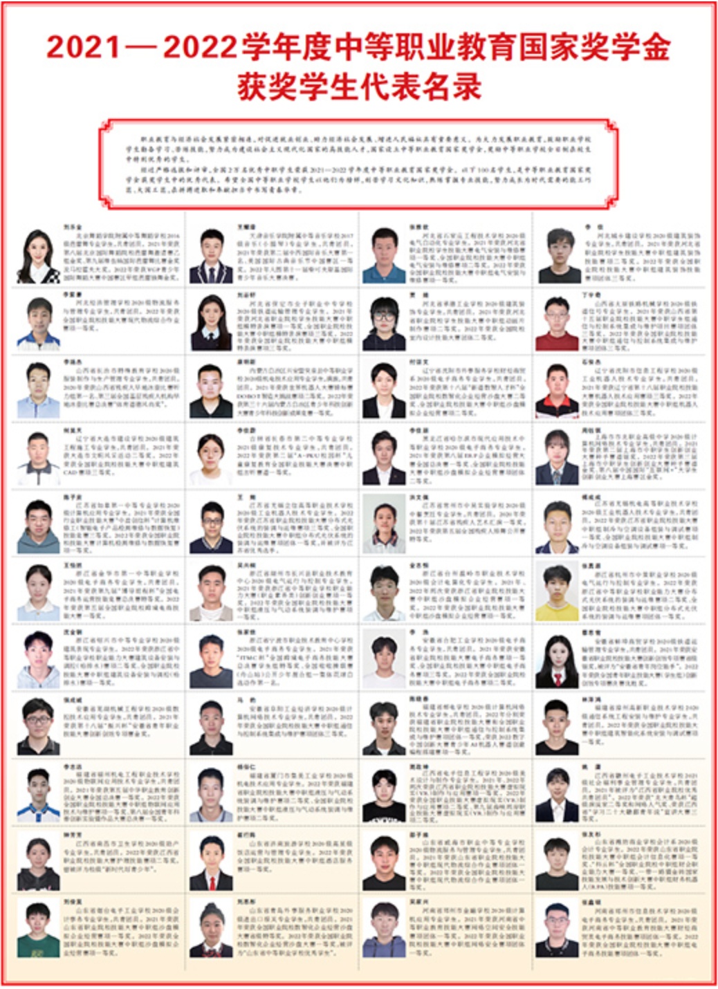 职业教育与经济社会发展紧密相连,对促进就业创业、助力经济社会发展、增进人民福祉具有重要意义。为大力发展职业教育,鼓励职业学校学生勤奋学习、苦练技能,努力成为建设社会主义现代化国家的高技能人才,国家设立中等职业教育国家奖学金,奖励中等职业学校全日制在校生中特别优秀的学生。 经过严格选拔和评审,全国2万名优秀中职学生荣获2021—2022学年度中等职业教育国家奖学金。以上100名学生,是中等职业教育国家奖学金获奖学生中的优秀代表。希望全国中等职业学校学生以他们为榜样,刻苦学习文化知识,熟练掌握专业技能,努力成长为时代需要的能工巧匠、大国工匠,在拼搏进取和奉献担当中书写青春华章。 江苏省共4名学生入选《2021—2022学年度中等职业教育国家奖学金获奖学生代表名录》,他们是:江苏省如皋第一中等专业学校陈子贡、江苏省无锡立信高等职业技术学校王朔、江苏省常州市中吴实验学校洪文佩、江苏省无锡机电高等职业技术学校傅成成。 江苏省如皋第一中等专业学校陈子贡 江苏省如皋第一中等专业学校2020级计算机应用专业学生。2021年荣获全国行业职业技能大赛“中盈创信杯”计算机维修工(智能电子产品检测维修与数据恢复)技能竞赛三等奖。2022年荣获全国职业院校技能大赛计算机检测维修与数据恢复赛项一等奖。 江苏省无锡立信高等职业技术学校王朔 江苏省无锡立信高等职业技术学校2020级工业机器人技术专业学生。2022年荣获江苏省职业院校技能大赛分布式光伏系统的装调与运维赛项三等奖、全国职业院校技能大赛中职组分布式光伏系统的装调与运维赛项团体一等奖,并被评为江苏省优秀选手。 江苏省常州市中吴实验学校洪文佩 江苏省常州市中吴实验学校2020级中餐烹饪专业学生,共青团员。2020年荣获第十届江苏省残疾人艺术汇演一等奖。2022年荣获第五届全国残疾人排舞公开赛特等奖。 江苏省无锡机电高等职业技术学校傅成成 江苏省无锡机电高等职业技术学校2020级工业机器人技术专业学生,共青团员。2022年荣获江苏省职业院校技能大赛中职组制冷与空调设备组装与调试赛项一等奖、全国职业院校技能大赛中职组制冷与空调设备组装与调试赛项一等奖。 |