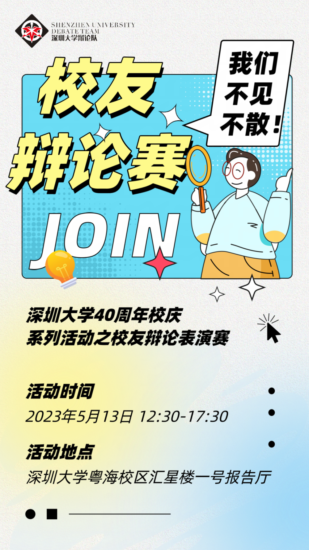 ?校友辩论表演赛? 沉浸式体验校园辩论氛围 重温校园时光 让我们以辩会友 共贺校庆 时间:5月13日 12:30-17:30 地点:粤海校区汇星楼一号报告厅