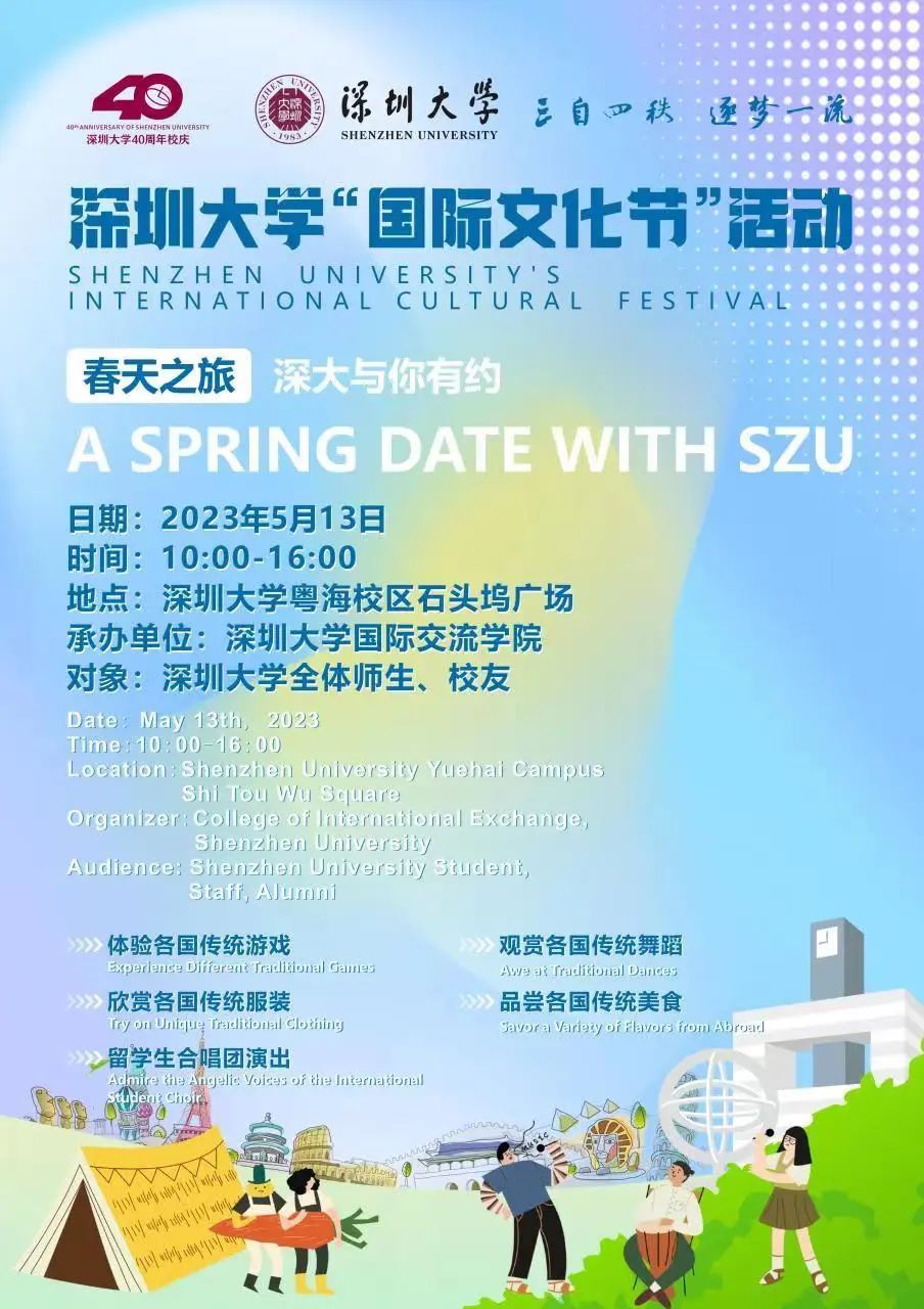 又是一年莺燕归巢时 思念的风 又吹到了文山湖畔 这一次 我们给所有荔园学子发来邀请 诚挚邀请校友们回到荔园 重拾校园记忆 5月13日-5月14日 校友返校日活动 粤海、丽湖两校区 共同向校友们敞开怀抱 用丰富多彩的系列活动 欢迎校友们回家 粤海校区活动 5月13日 8:30-21:30 01 演出类 庆祝深圳大学校庆40周年 室外音乐演奏会 “音乐,应使人类的精神爆发出火花。” 让我们乘着音乐的风 感受艺术的美好 时间:5月13日 17:00-18:00 地点:粤海校区日晷广场(活动由博兰斯勒钢琴提供支持)