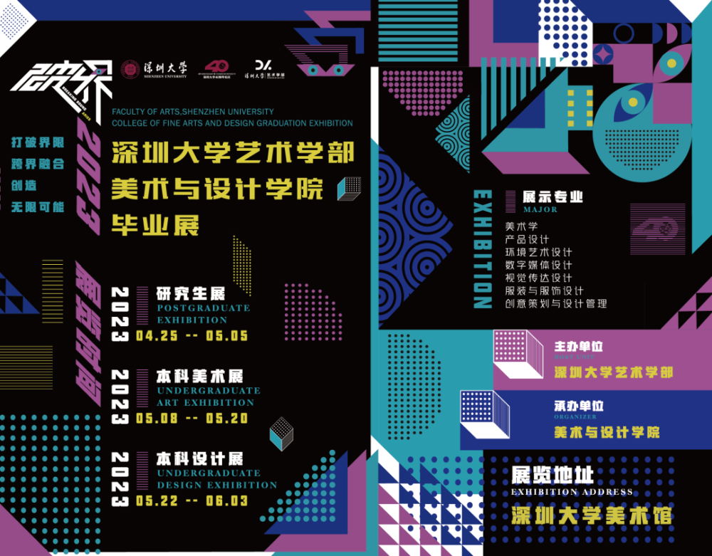 ?美术与设计学院美术系毕业作品展? 时间:4月25日-6月3日 8:30-19:00 地点:粤海校区美术馆 简介:此次展览以“破界”为主题,将现有的艺术与创新精神相融合,不断地探索出艺术跨界的新潮流。学生作品风格各异,展现出深大学子青春的活力,蕴藏着学生们对未来无限的热情与憧憬。