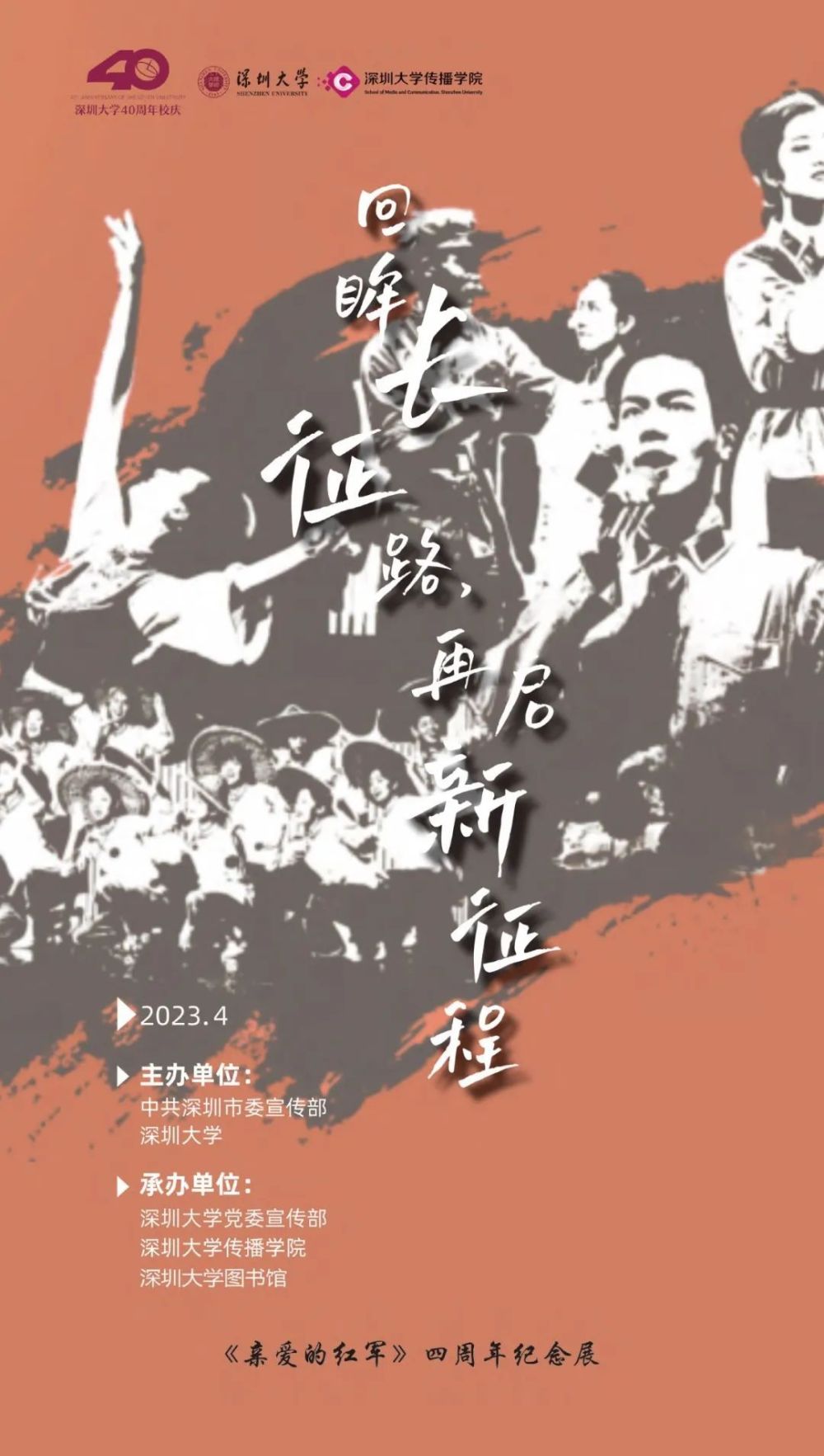 ?《亲爱的红军》四周年纪念展? 展出时间:4月21日起 9:00-17:00 展出地点:粤海校区汇智楼图书馆(南馆)二楼大厅 简介:《亲爱的红军》是由中共深圳市委宣传部指导,深圳大学党委宣传部、传播学院联合推出的一部大型公益舞台讲演剧。自2019年首次公演以来,已演出27场,主流媒体多次报道。本次纪念展,以《亲爱的红军》创作、演出经历为基础,通过图文及视频再述长征故事、传承红色文化,感悟长征精神。