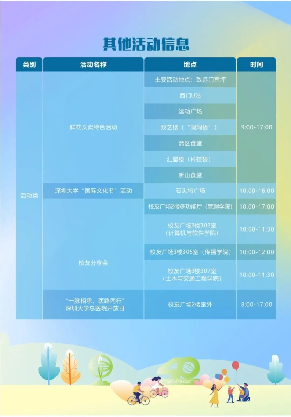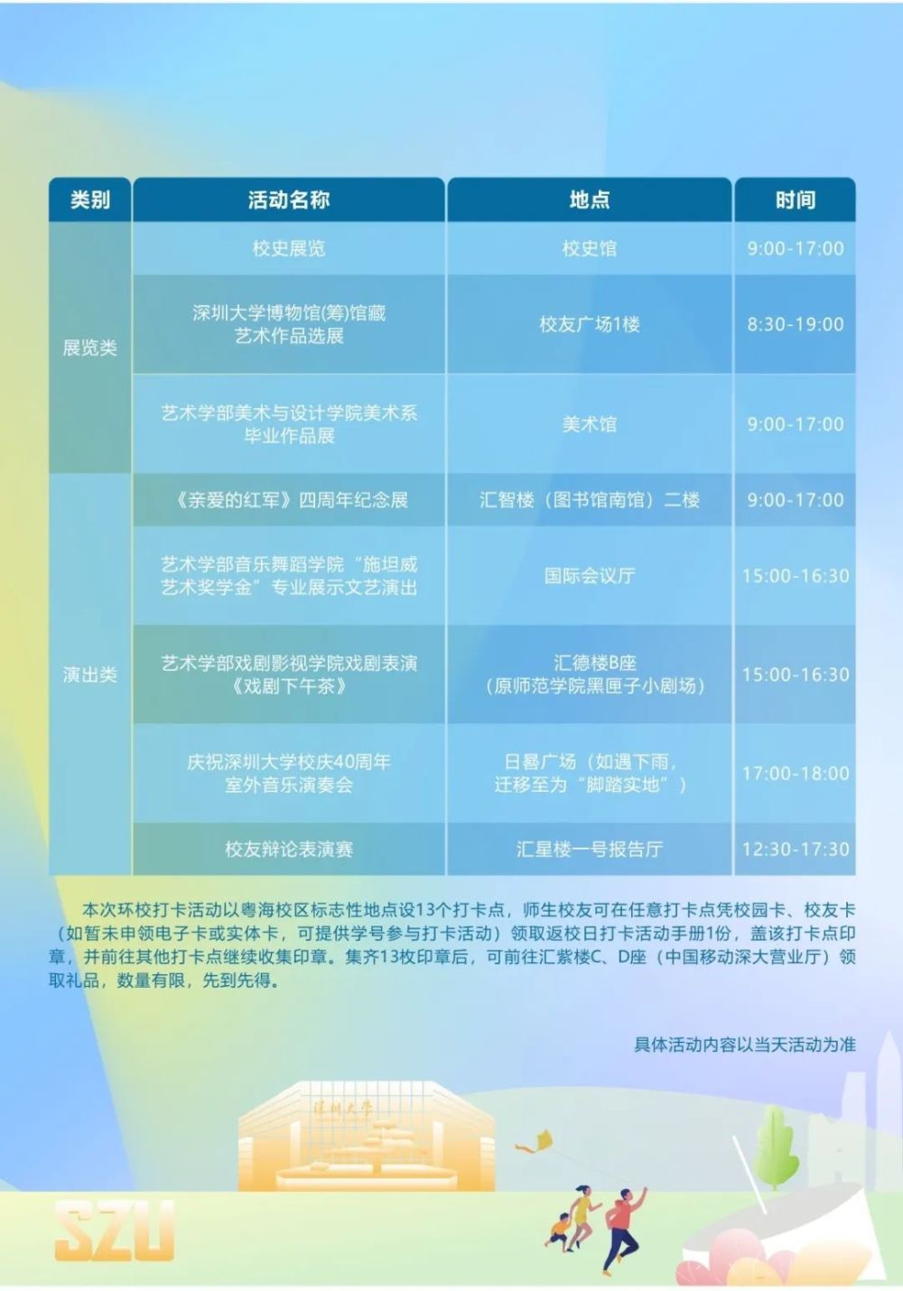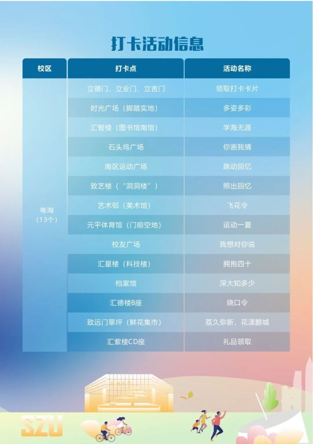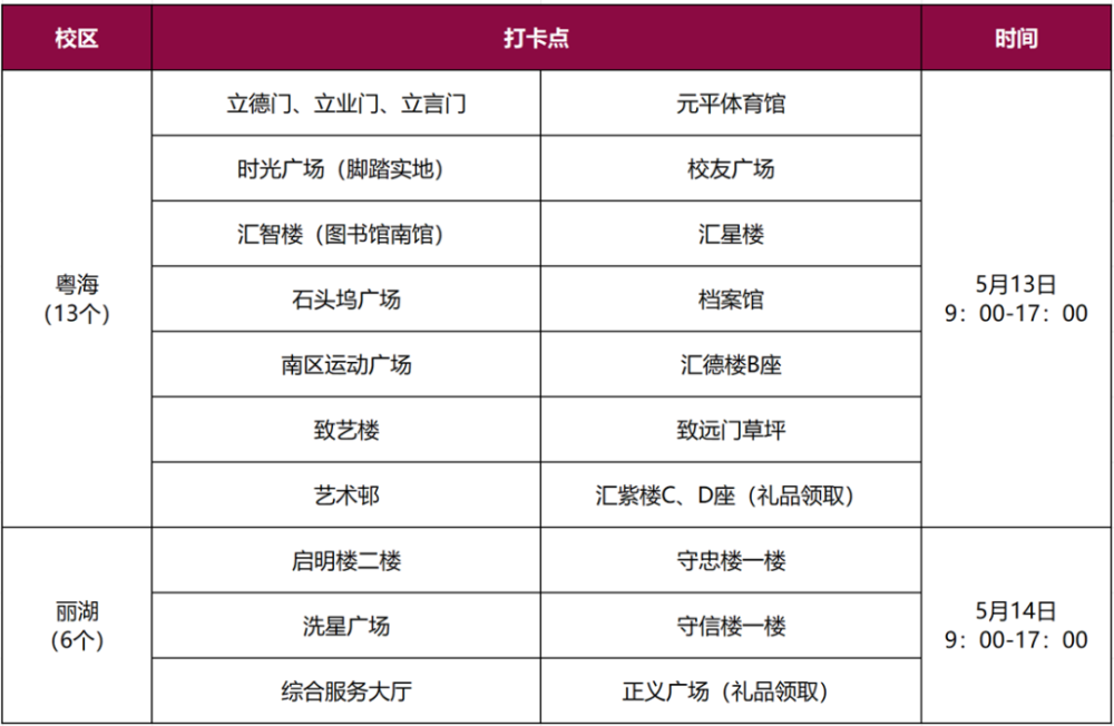 ?校友对话论坛交流会? 材料学院 时间:5月14日 10:00-12:00 地点:丽湖校区材料学院B2-534 双校区共同活动 5月13日(粤海校区)-5月14日(丽湖校区) 9:00-18:00 ?环校打卡? 重温校园 追寻记忆 快来打卡点领取卡片 参与游戏并盖章 集齐盖章还能兑换专属礼品! 时间:5月13日-5月14日 9:00-17:00 地点:详见下图