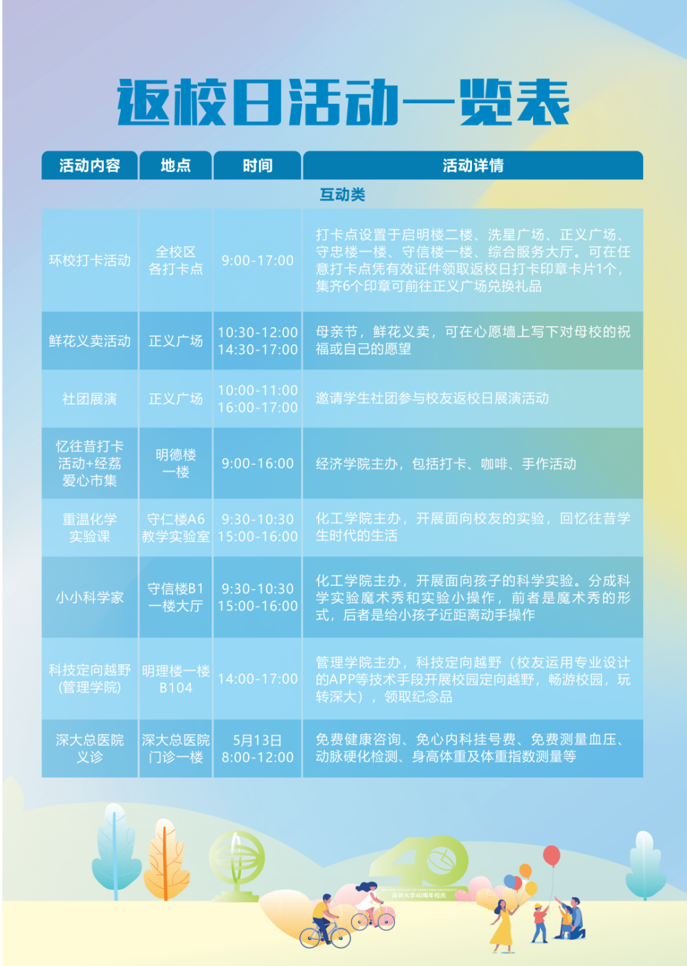重温化学实验课 来通过一系列的化学实验 找寻学生时代的学习生活记忆吧! 时间:5月14日 9:30-10:30;15:00-16:00 地点:丽湖校区守仁楼A6教学实验室 ?小小科学家? 面对孩子们的科学实验来啦 相信通过科学实验魔术秀和科学小实验 孩子们定会度过难忘的一天 时间:5月14日 9:30-10:30;15:00-16:00 地点:丽湖校区守信楼B1一楼大厅 ?科技定向越野? 想通过科技手段“云”越野吗 那就快来这里 通过校友带来的“黑科技” 畅游校园 玩转深大 时间:5月14日 14:00-17:00 地点:丽湖校区明理楼一楼B104