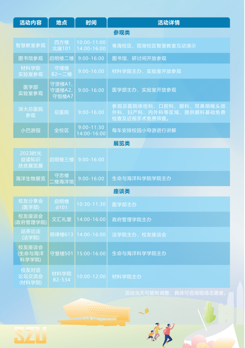 03 展览类 ?校史展览? 时间:5月13日 9:00-17:00 地点:粤海校区档案馆一楼校史馆 简介:展馆以纵横交错的时间为轴,以办学精神为主线,共设有11个展区,从不同侧面全方位展示深圳大学的办学成果,共展出学校珍贵的历史照片千余幅,以及档案史料、实物等百余件,生动展示了深圳大学作为深圳经济特区第一所综合性大学的成长足迹。欢迎各位校友回校参观,并为校史馆建设提出宝贵意见和建议。