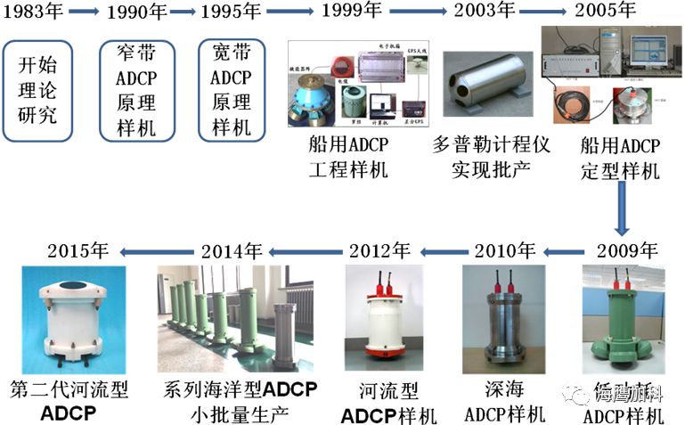 中国科学院声学研究所自20世纪八十年代开始研究声学多普勒测流测速技术,是国内研制ADCP的先驱。该所已经形成工作频率覆盖75kHz、150kHz、300kHz、600kHz和1200kHz,工作水深覆盖全海深(从水面到11000m)的系列ADCP和DVL产品,包含SC自容式型、DR直读式型和RIV河流型ADCP和DVLII型多普勒速度仪,且已在全球大洋和南北极实现应用。 0 U) _ {3 W, a/ X( O5 i$ L7 @
