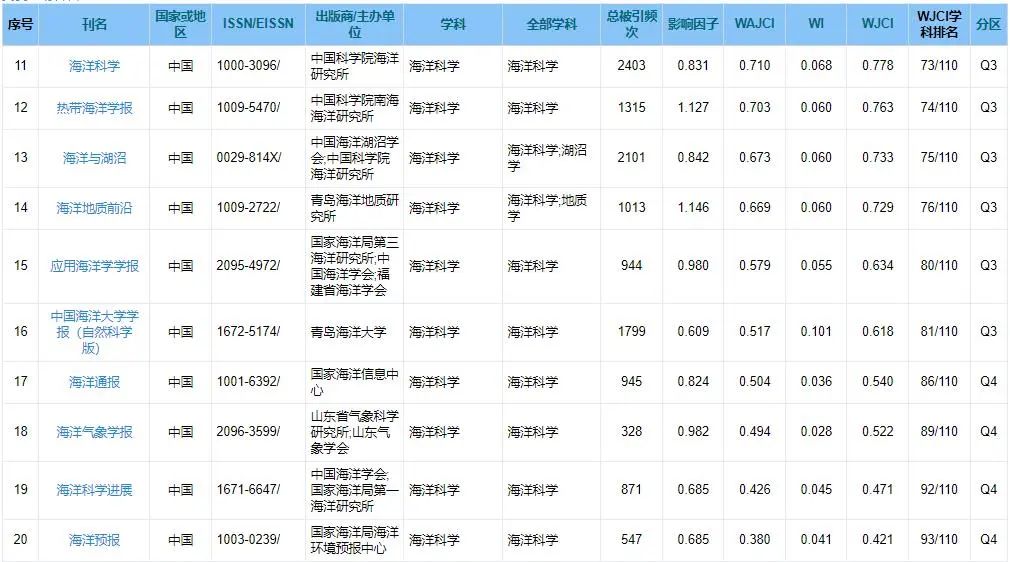 / b* U$ B, C9 {( k1 R p 近日,《世界期刊影响力指数(WJCI)报告》2023版(以下简称《WJCI报告》)正式发布,共收录中国期刊1772种,中国内地期刊的WJCI指数均值为1.487,居世界第八位,其中“海洋科学”学科共有22种期刊入选。Q1区1本;Q2区4本;Q3区11本;Q4区6本。