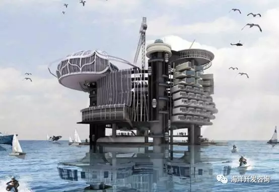 / ~; u3 b" n6 N9 @7 _( W0 r 2011年eVolo摩天大楼竞赛中,由马来西亚设计师Ku Yee Kee和Hor Suewern提交的方案受到了评委们的一致好评。该方案极具创意,在盘活原来开采矿物燃料的老钢铁平台的过程中,使用绿色能源,将其变成一个可持续发展的新城市栖息地。该方案探索了在海洋石油钻井平台上面和海平面下面生活的可能性。平台上的居住单位以层状分布,层叠单元的设计可以让所有的居民把浩瀚海洋尽收眼底,游船和悬臂式游泳池充满科技感。平台与水面间的区域作为娱乐区,供居住者共同享受。水下是从事海洋研究的实验室。设计中,该“水上新村”的屋顶铺设了大型太阳能电池板,钻机平台四周安装有风力涡轮机,海底更配备有潮汐能发电机,这些设施一同为“水上新村”供能。 % ~! h1 b6 Y* q* K9 Z