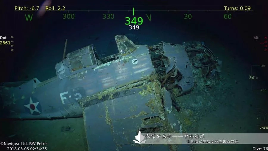 D* [. |' c0 y* U' f 散落海底,来自列克星敦号“菲力猫”中队的一架F-4F,是保罗团队让她得以重现在眼前