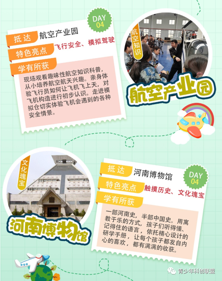本营亮点:一部河南史,半部中国史。用寓教于乐的方式,孩子们听得懂、记得住的语言,依托精心设计的研学手册,让每个孩子都不虚此行,收获满满。通过中国网络安全科技馆,探秘我们身边的网络安全“黑洞”;参观宇通、航投等企业,深入了解前沿科技的发展现状及应用领域;在河南博物馆、清明上河园,了解最纯粹的中华文化。