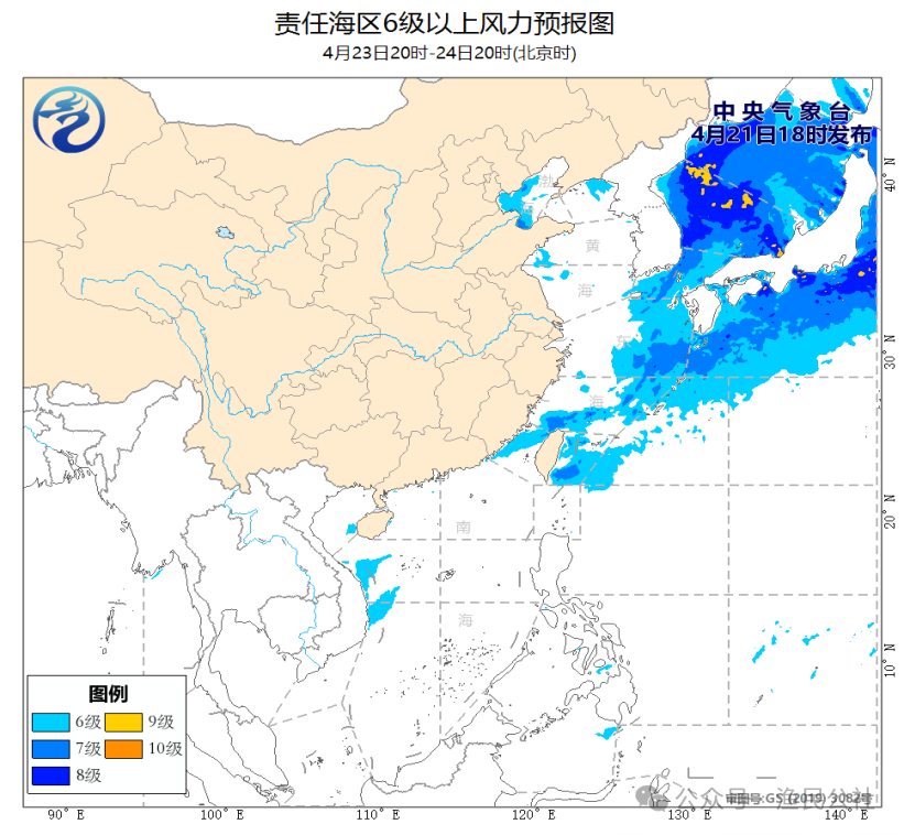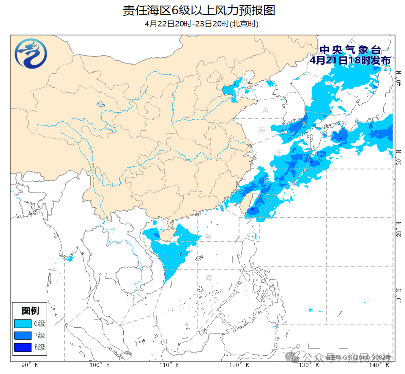 1 _) t* I* {: r: p, r9 Y 21日02时至14时,黄海中东部和东南部海域出现了6~7级、阵风8级的偏北风,南海北部海域、北部湾、台湾以东洋面出现了5~7级、阵风8级的偏南风或西南风。