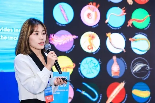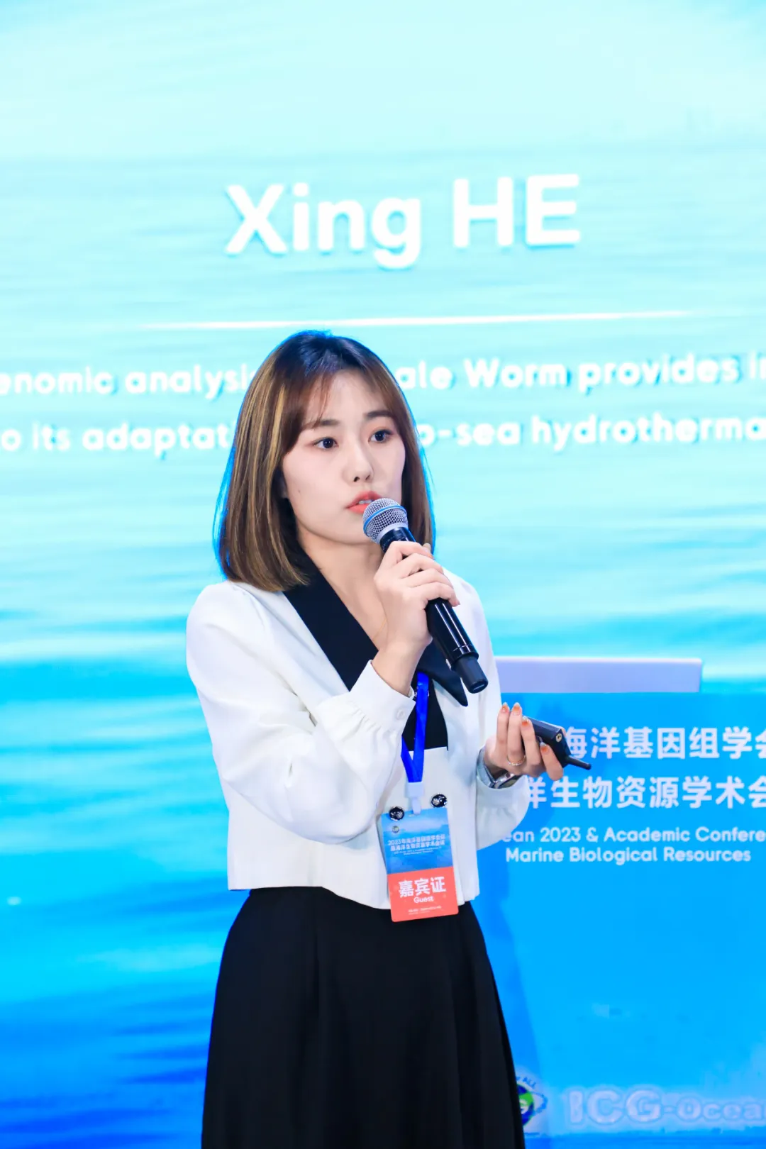Biological Resources)于2023年10月28日-29日在青岛华大如期举行。本届大会在贯彻落实海洋强国战略,加速布局基因科技未来产业发展起到了积极的推动作用。会议由青岛自贸片区管委、中国海洋学会海洋生物资源专业委员会、深圳华大生命科学研究院主办,吸引了来自9个国家的300余位海洋基因组学及海洋生物资源领域的专家学者参加。本次会议的主题是“海洋生物组学:科技驱动的海洋生物遗传资源研究与应用”,旨在交流海洋科技创新、基因科技未来产业发展的现状并探索未来发展趋势,同时分享海洋基因组学领域国际合作的实践经验,为国家海洋强国战略服务蓄势聚能。会议包括专家学术报告22个和青年学者与学术研究成果展示12个。为期2天的专家学术报告汇聚了22位来自世界各地的顶尖海洋领域专家,深入研讨了海洋生态系统保护、海洋动植物演化、海洋生物环境适应的分子机制、海洋生物资源利用等重要议题,展示了一系列令人激动的研究成果和创新理念。这些最新的研究成果将为我们更好地保护海洋生态系统和利用海洋资源提供重要的科学依据和指导,推动海洋科学领域的进一步发展。会议特别设置了青年学者与学生研究成果展示环节,在这个环节中,来自不同科研院所的12位青年学者分别展示了他们的研究成果和突破性发现,这些研究涉及了海洋基因组学的多样性、进化、功能以及应用等多个方面。通过分享他们的研究成果,青年学者们向与会者展示了在海洋基因领域的深入探索和独到见解,为会议增添了新的亮点,展现了海洋基因组学领域年轻一代的活力和潜力。他们的研究成果将为海洋科学的进一步发展提供新的思路和方向。本研究所海洋化能合成生态系统团队的贺星同学参加本次大会。贺星同学在本会场做了题目为“Genomic analysis of a scale worm provides insights: D1 e. L: Y- U7 i0 Q$ a