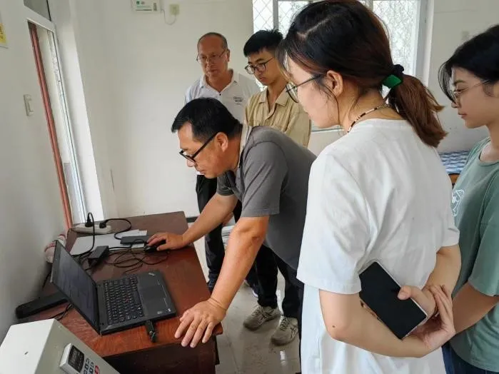郑刚站长带领团队成员观看、记录水位,介绍如何使用声学多普勒流速剖面仪(ADCP)进行河道流量、流速、水位、河宽等数据的采集,讲解其工作原理,同时还演示了电波流速仪的使用方法,在实习期间,实践团成员在冶河上多次进行测流工作,深入水文工作一线。